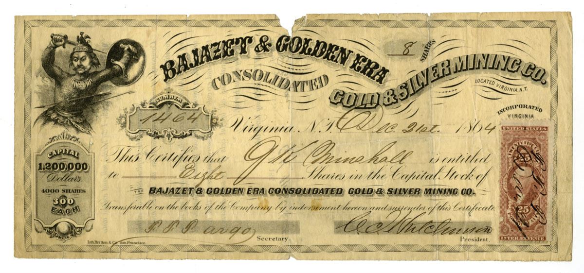 Nevada, (Inc. in Virginia), December 31, 1864. 8 Shares I/U Capital Stock Certificate, Black text with black border, Asian warrior with shield and sword at top left corner, S/N 1464, 25 Cent Revenue stamp at right side, Fine condition with a nick out of the top middle margin, light foxing in the middle but overall in very attractive, Signed by president C.J. Hutchinson and secretary F.F. Fargo. Britton & Co. This certificate was issued only 2 months after Nevada Statehood.