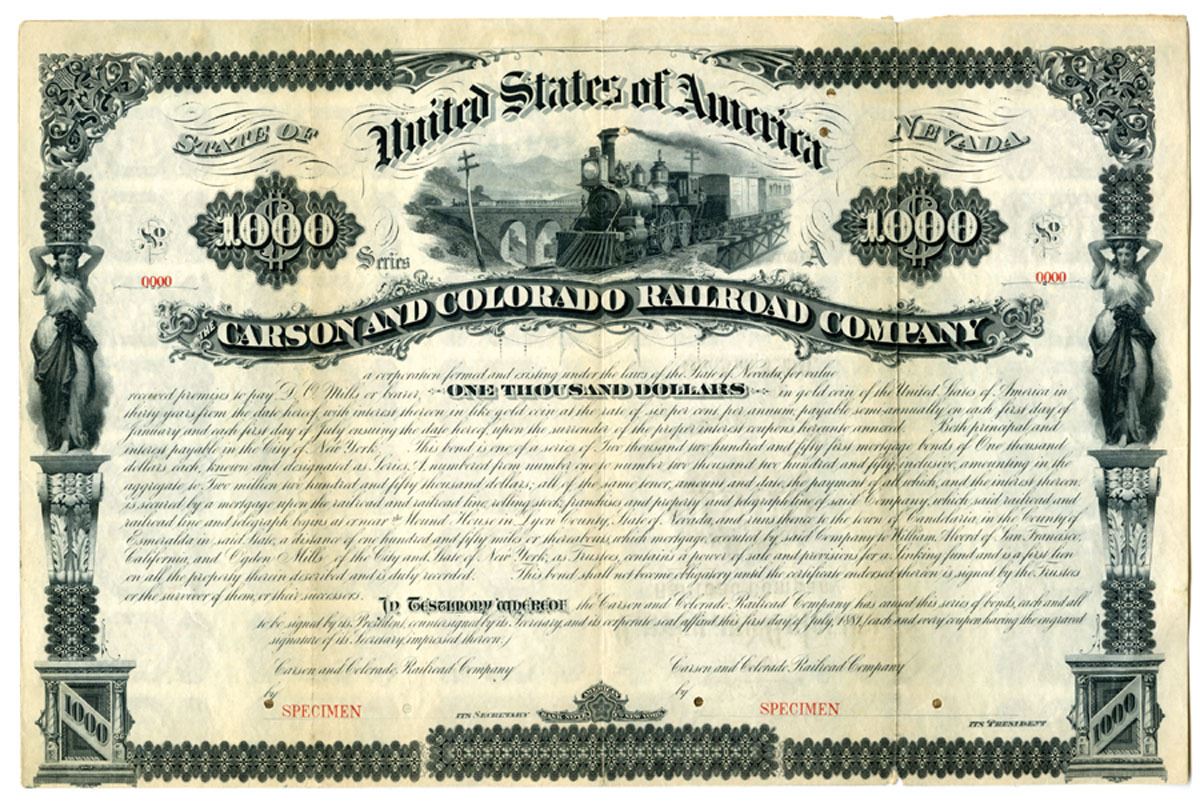 Nevada, 1881. $1000 Specimen 6% Series A First Mortgage Series A Coupon Bond, Black print with ornate black border, Locomotive at top above company at center, Specimen overprints and POCs, VF to XF condition. ABNC.