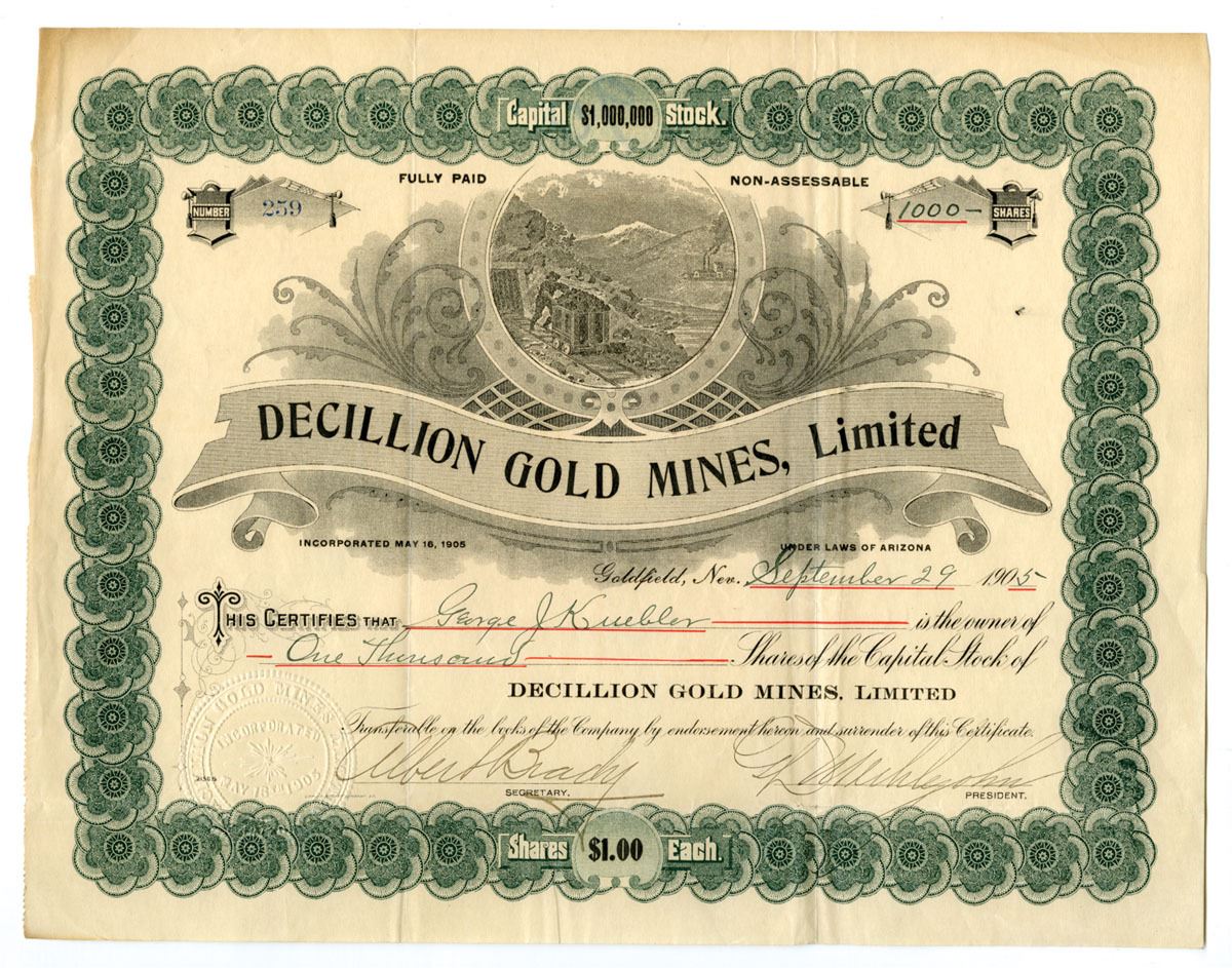 Goldfield, Nevada (Incorporated in Arizona), 1905. 1000 Shares Capital Stock I/U Certificate, Black print with green border, Large mining vignette is circular frame above large format title, S/N 259, Fine to VF+ condition with minor splitting at top margin.