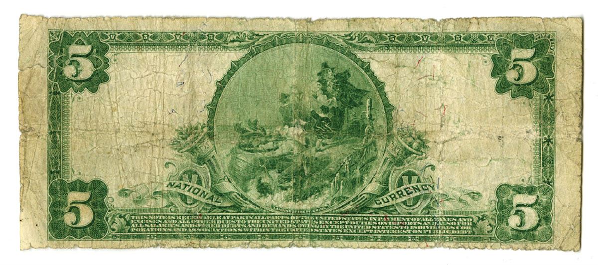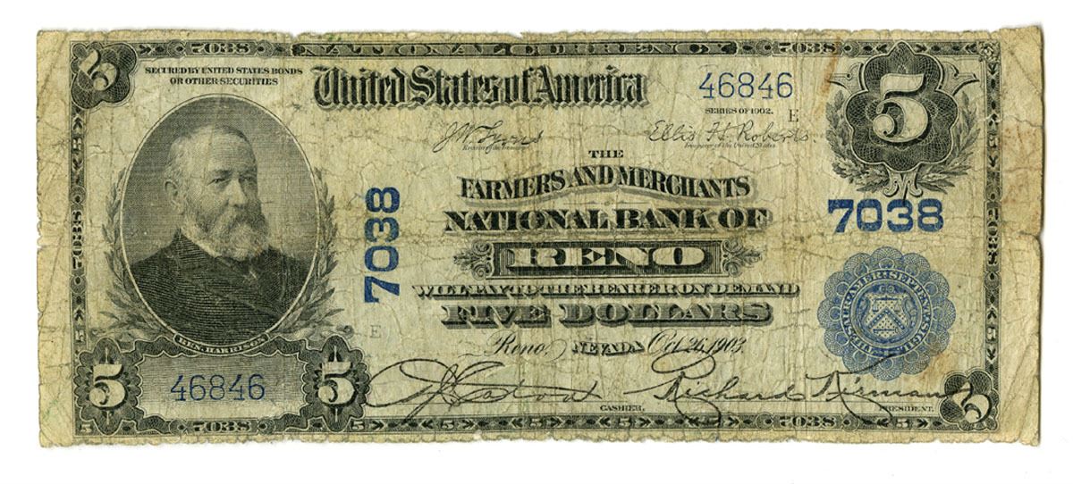 Reno, Nevada. 1902, $5 PB, Issued banknote, Harrison at left, S/N 46846, Lyons | Roberts signatures, Choice VG to Fine condition with rough lower and upper borders, BEP.