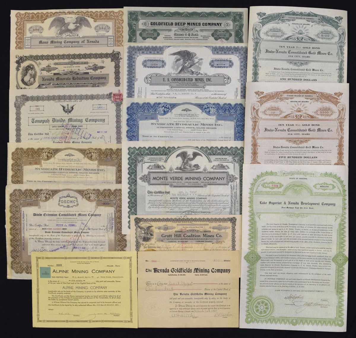 Nevada, Arizona, Idaho., ca.1900-50s. Lot of 15, I/U and I/C stock and bond certificates, Includes: Mono Mining Co of Nevada; Nevada Minerals Extraction Co; Tonopah Divide Mining Co; Syndicate Hydraulic Mines Inc (2); Doble Extension Consolidated Mines Co; Alpine Mining Co; Nevada Goldfields Mining Co; Goldfield Deep Mines Co; U.S. Consolidated Mines Inc; Monte Verde Mining Co; Grutt Hill Coalition Mines Co; Idaho-Nevada Consolidated Gold Mines Co (2); Lake Superior & Nevada Development Co. Strong group representing classic western mining ventures, with a mix of ornate borders, vignettes, and varied color schemes typical of the region’s early speculative industries. Printed by multiple bank note and job printers overall, conditions range from Fine to XF with expected folds, wear, and cancellations. (15). Sold “AS IS” no returns accepted.