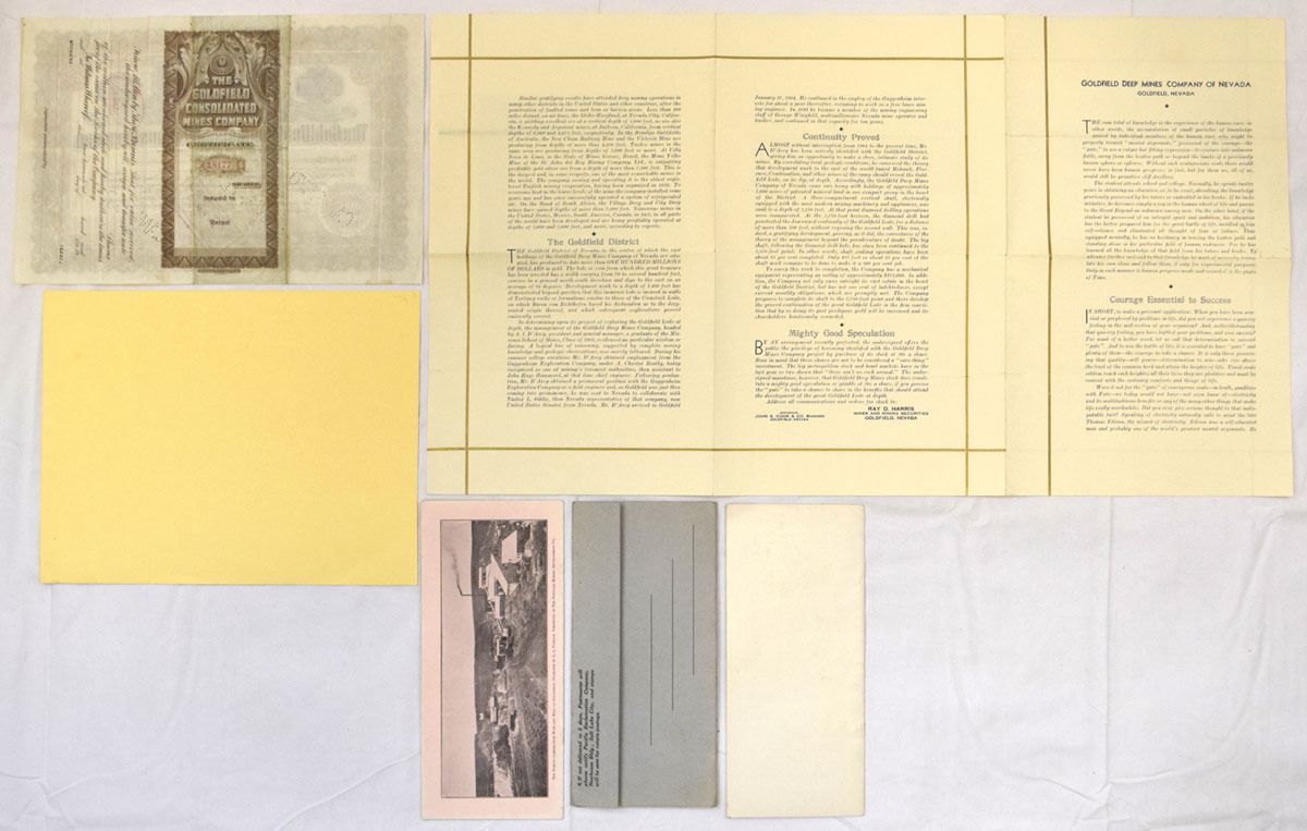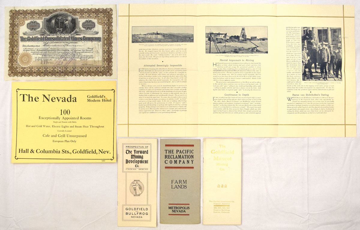 Goldfield, Nevada, ca.1900s. Lot of mining-era ephemera and one issued stock certificate reflecting the height of the Goldfield mining boom. The lot includes an issued stock certificate from Goldfield Consolidated Mines Company, along with multiple original promotional and informational pieces relating to mining, development, and town infrastructure in and around Goldfield. Ephemera present includes mining prospectuses and pamphlets from companies such as Forward Mining Development Co., Pacific Reclamation Company (Metropolis, Nevada farm lands), Goldfield Mascot Mining Co., and Goldfield Deep Mines Company, as well as a period advertising card for Nevada Hotel and a photographic postcard view related to Goldfield mining operations. Materials feature period photography, descriptive text on mining methods and development, and contemporary promotional language typical of the era. Conditions range from Good to VF overall. (6). Sold "AS IS" no returns accepted.