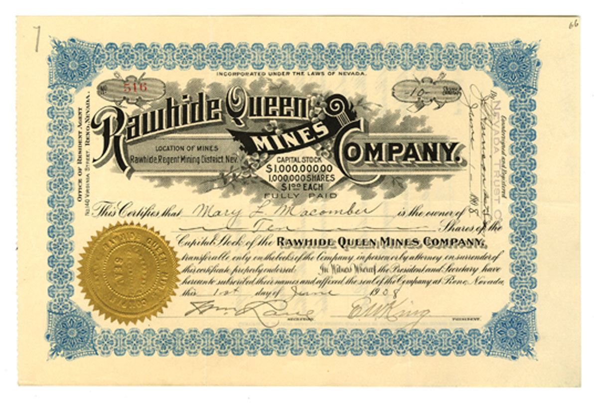 Rawhide Regent Mining District, Reno, Nevada, 1908. 10 Shares Capital Stock I/U Certificate, Black with blue border and gold seal, Company title at top, S/N 516, VF to XF condition.