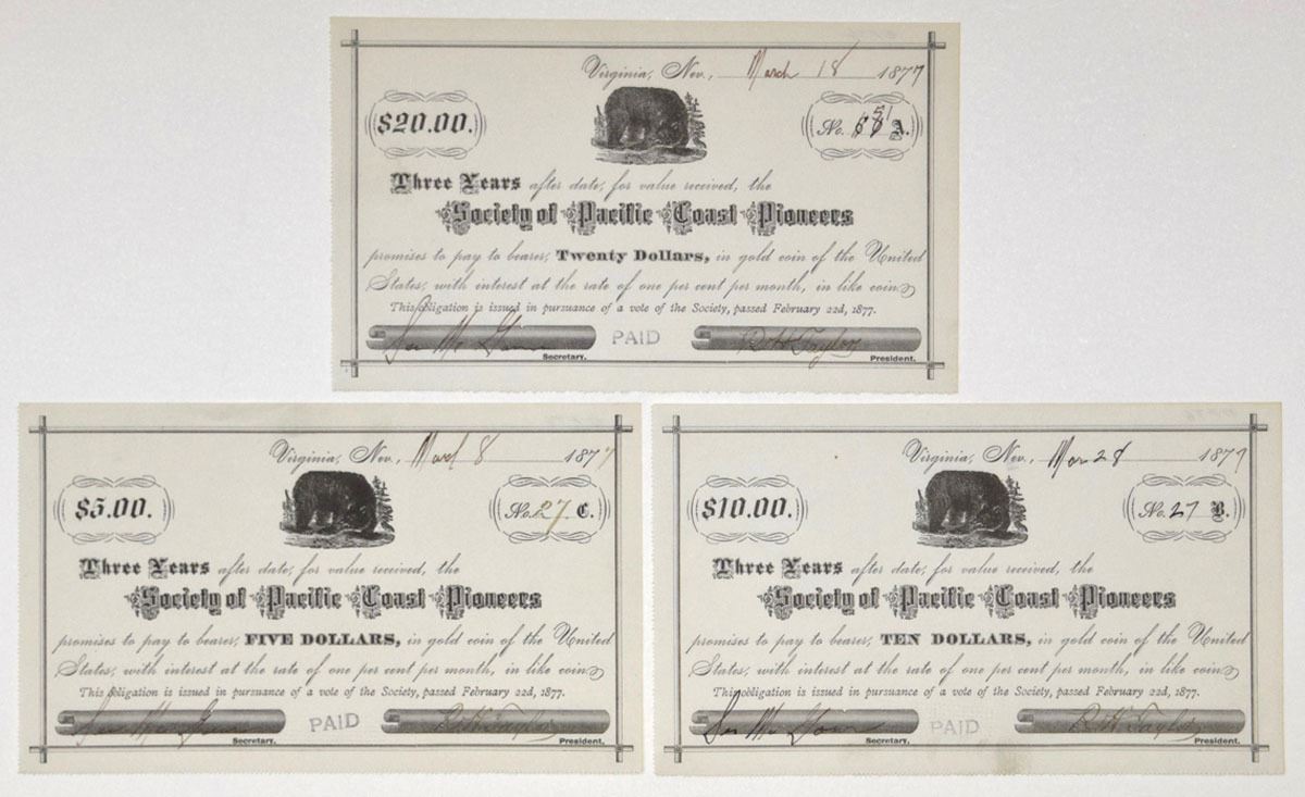 Virginia, Nevada, 1877. Lot of 3 I/C early engraved promissory notes issued by the Society of Pacific Coast Pioneers, denominated in gold coin of the United States. Includes $5, $10, and $20 notes, each bearing the vignette of a bear and forest at center, ornate border corners, and manuscript dates of March 18 and March 29, 1877. Each note promises payment with 1% monthly interest, pursuant to a vote of the Society on February 22, 1877, and is signed by the secretary and president with “PAID” noted at bottom. AU to Uncirculated condition. (3). Founded in 1877, the Society of Pacific Coast Pioneers was created to honor the early settlers who helped shape the western territories before statehood. Its members included miners, merchants, and frontiersmen who took part in the Gold Rush and early development of Nevada and California. The organization preserved pioneer history through reunions and records celebrating the region’s earliest builders and explorers. These denominated bearer notes, $5, $10, and $20, represents an early private obligation of the Society of Pacific Coast Pioneers, payable in gold coin of the United States three years after date with interest at one percent per month. Though formally promissory notes, their printed denomination, payable-to-bearer clause, and engraved presentation suggest they may also have circulated locally among Society members and Virginia City merchants as a form of short-term, interest-bearing scrip. The Society, founded to honor and assist early settlers of the Pacific Coast, issued these notes pursuant to a vote of the organization dated February 22, 1877, likely as part of a fundraising or membership-financing effort.