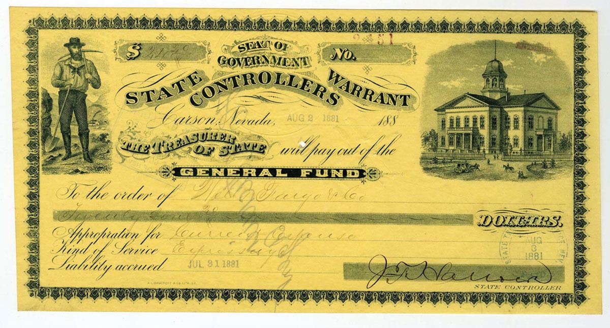 Carson, Nevada. $24.20, Issued and cancelled Warrant made out to Wells Fargo & Co., Black on light yellow paper with miner on upper left, "Express Services", VF.