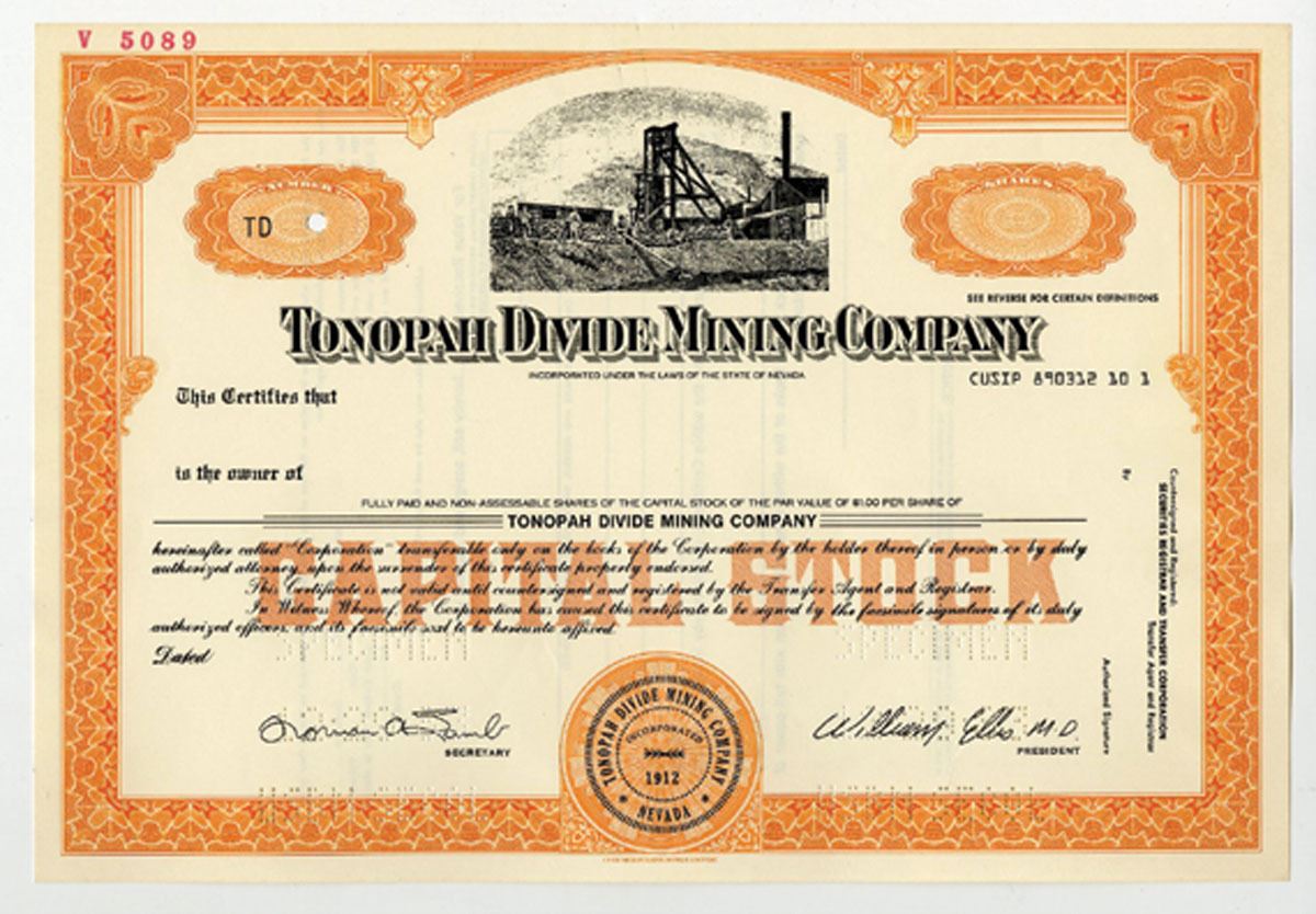 Tonopah, Nevada. Tonopah Divide Mining Co., 1960's Specimen Odd Shares Stock Certificate. CBN