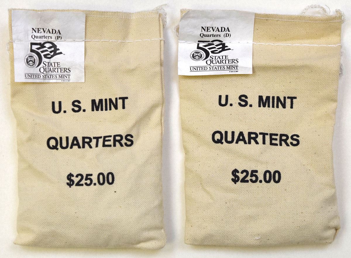 Nevada, 1998. Lot of 2 U.S. Mint Sewn Bags each with $25 of Nevada's State Quarters, 1 Bag is 1998-P (minted in Philadelphia) and other is 1998-D (minted in Denver), Bags are in original packaging with original label from mint, AU to UNC condition. (2). Sold "AS IS" no returns accepted.