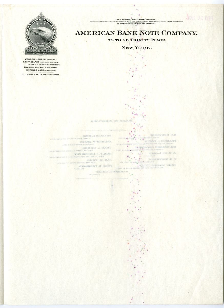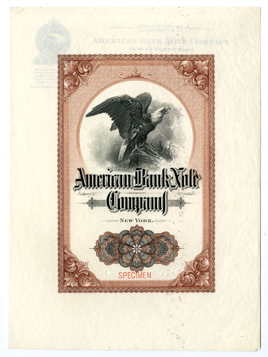 New York. Large format 2 page Letterhead and cover page that unfolds, the cover with a large screaming eagle, printed black with reddish-brown border and m/c underprint, inside is a letterhead . The back page lists the officers of ABNC. Uncirculated. Impressive and attractive.
