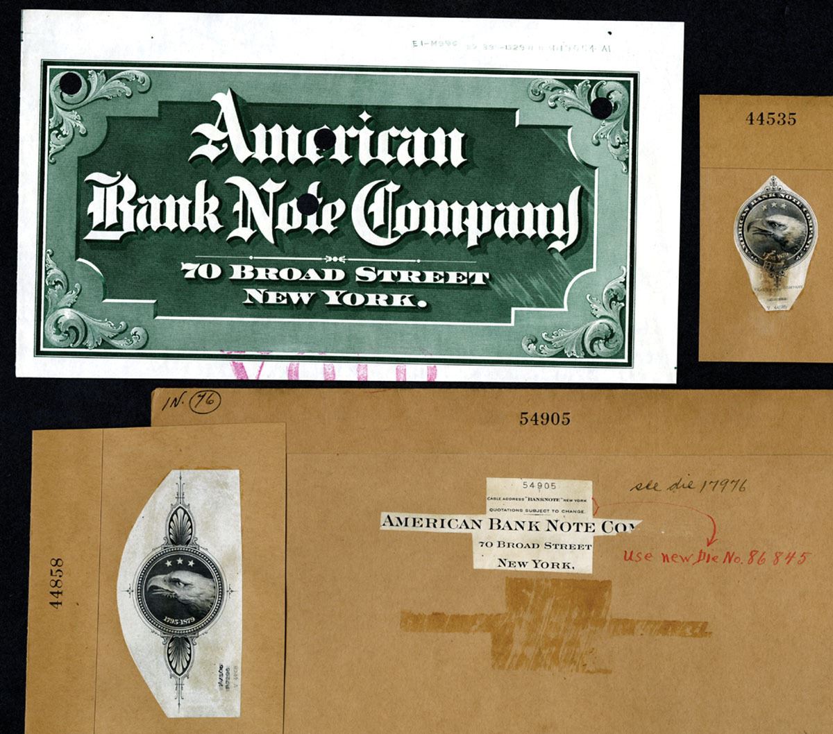 New York. Lot of 7 proof ABN advertising items, Includes Proofs of Letterhead, Annual Report, Service Certificate, Calendar top, Eagle heads, Bonds. India paper proofs mounted on die reference folders, partial folders, or unattached. Circa 1930's to 1940's. VF to Unc., 7 pieces.