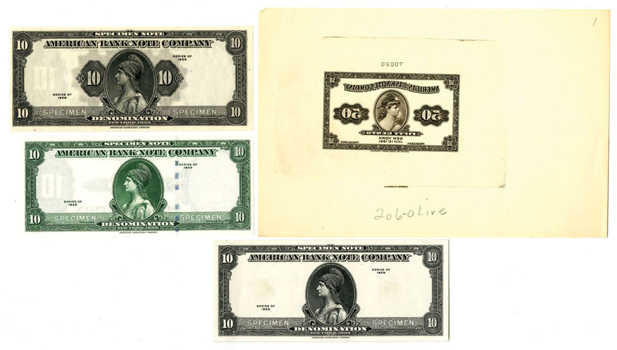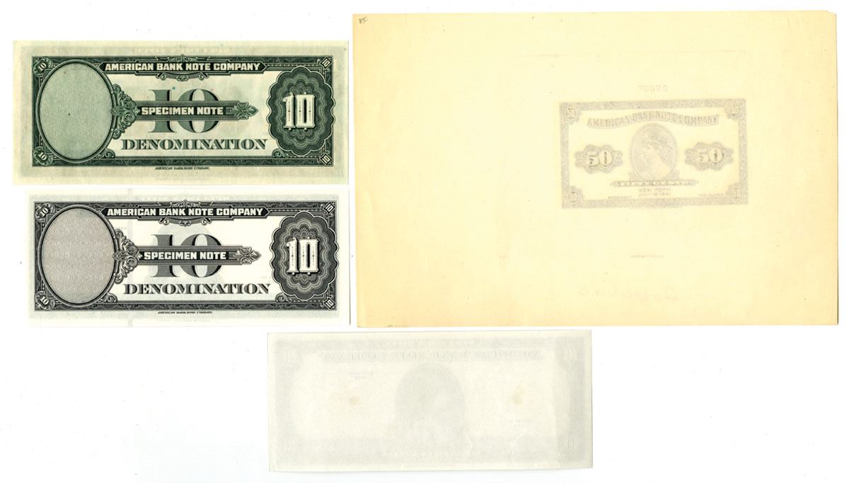 New York, Lot of 4 advertising notes, includes s 50 Cents, small format example printed litho in reverse in olive as a Large Die Proof, dated 1921 with Liberty with Star on headband facing right; 3 different versions of the 10 Denomination, 1929 versions with Liberty and cap facing left in different colors or paper, including a uniface proof on white paper that is printed in black; a version printed with the obverse green and reverse black on white watermarked paper with Malaysia tiger watermark and thick silver security thread; and, a 3rd version with a black obverse and green reverse, but printed on thin TYVEK polymer paper, very rare in this format. All are in Unc. to CU condition. (3). ABNC.