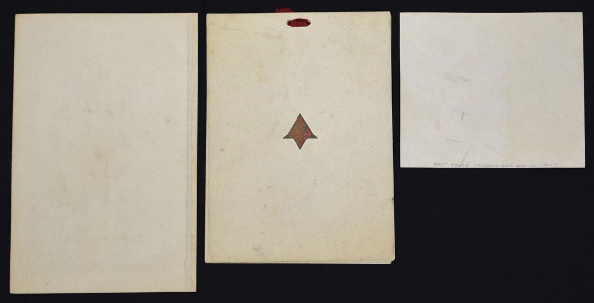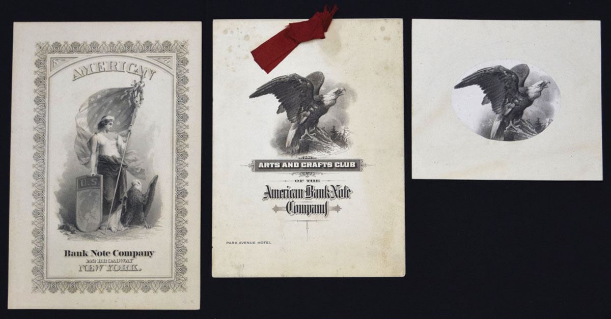 New York. Lot of 3 ABNC advertising and related items, Includes ca. 1860-70s, Standing Liberty, Shield and Eagle on thin beige card; a 1909 "Arts and Crafts Club" banquet booklet with Screaming Eagle vignette with matching Large Die Proof vignette. All are in Choice AU to Uncirculated. (3)