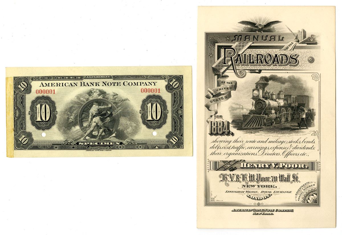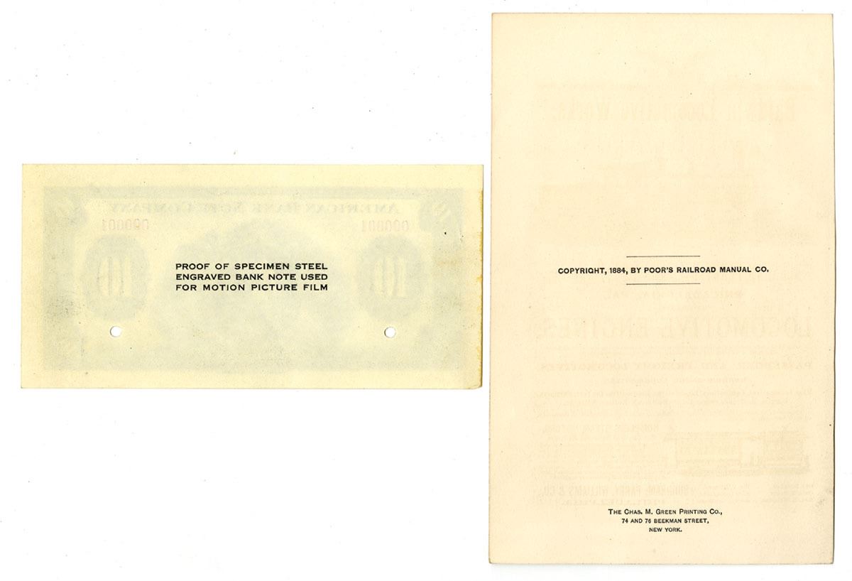 New York. Lot of 2 items, Includes "10 " Denomination Advertising Note with Wheel of Progress with S/N "000001", And a Poor's Manual advertising plate with locomotive. ABNC (2)