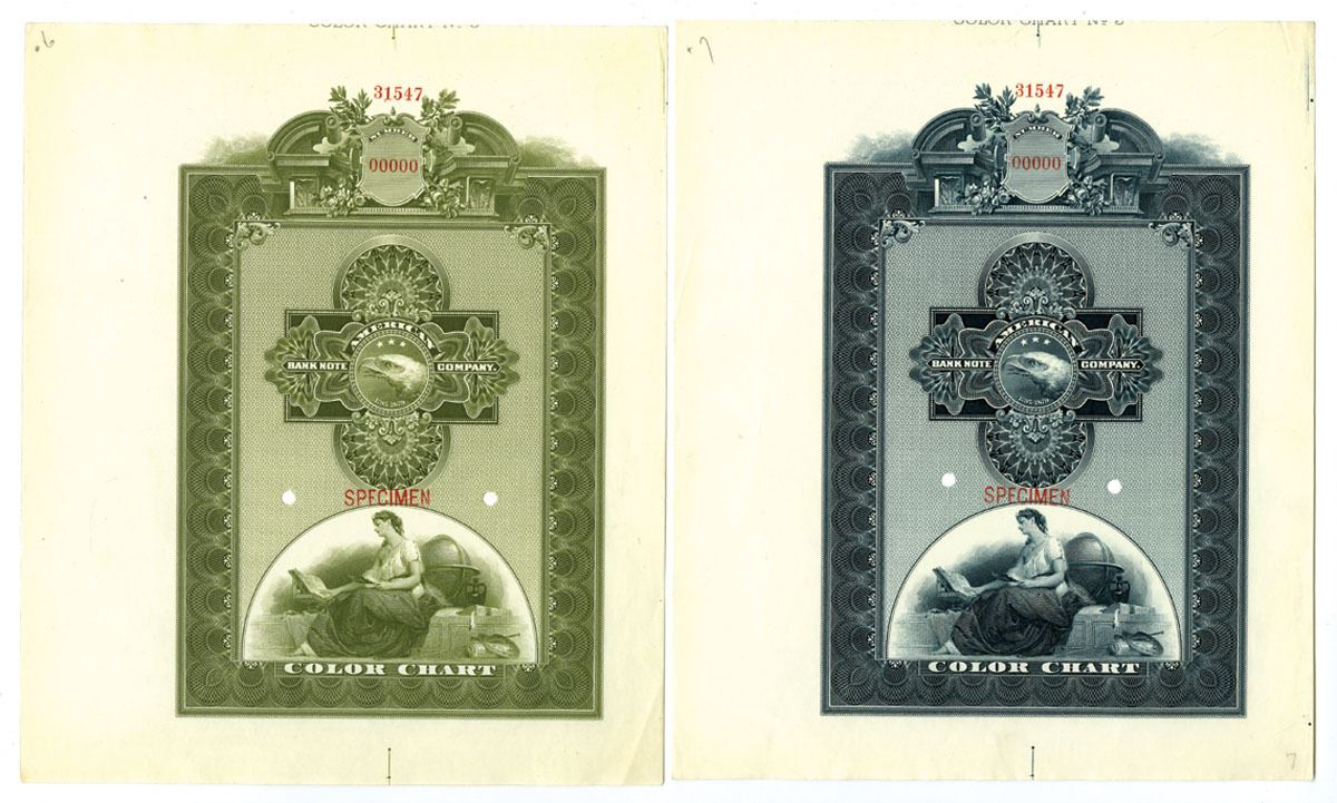 New York, Lot of 2 similar design but different colors of the Color Chart Specimens, both with large seated allegorical woman with globe, reading a book with ABN Screaming Eagle on top, the lot includes a dark blue version and a olive green version, both with POCs and Specimen overprints, both in Choice AU to Uncirculated condition. ABNC (2)