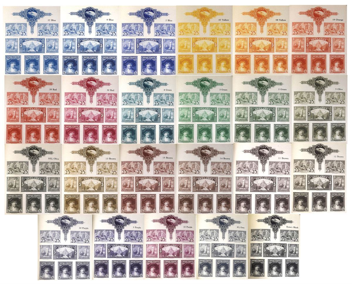 NY. Leather bound Color Sample book with 23 pages, the outer cover has gold lettering "No. 49 - Color Chart For Steel Engraved Postage and Revenue Stamps - A.B.N.Co", each page consists of the ABN logo on top with the listing of the color and color number, for example "17 Blue", with 8 postage stamp appearing stamps, in the color the page is labeled with, all with "Specimen" engraved into the design, with the top row stamps labeled "Communication" on the left and right, the next row has 3 stamps, "Education"-"Taj Mahal"-"Education", with the bottom row with 3 similar "Rembrandt" stamps with his portrait, The reverse of each sheet is blank and is slightly glossy, but not gummed. The condition is Superb Uncirculated with the booklet appearing as made. Rare color sample book that should appeal to philatelic and security printing enthusiasts.