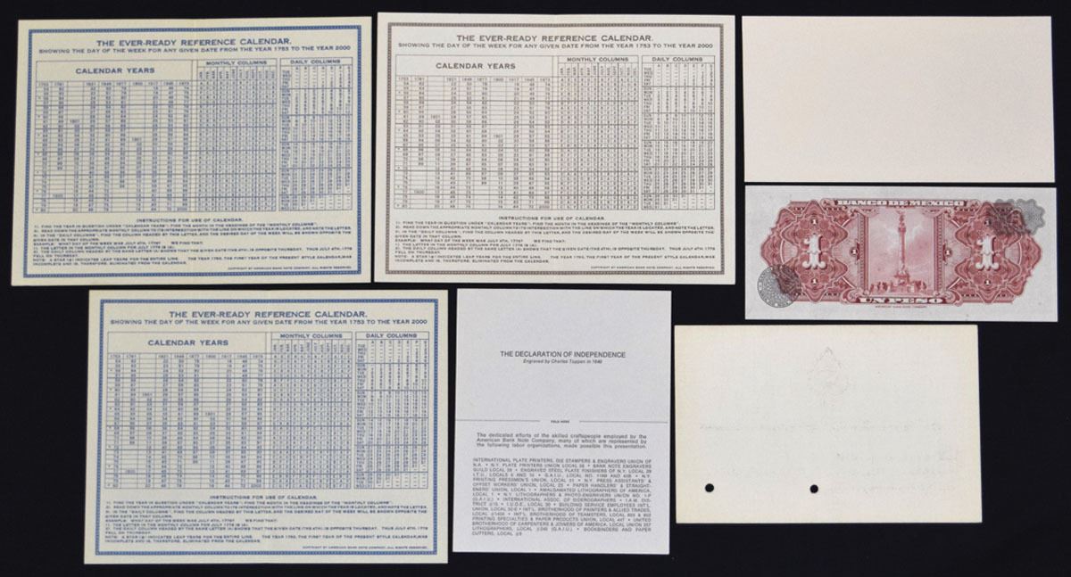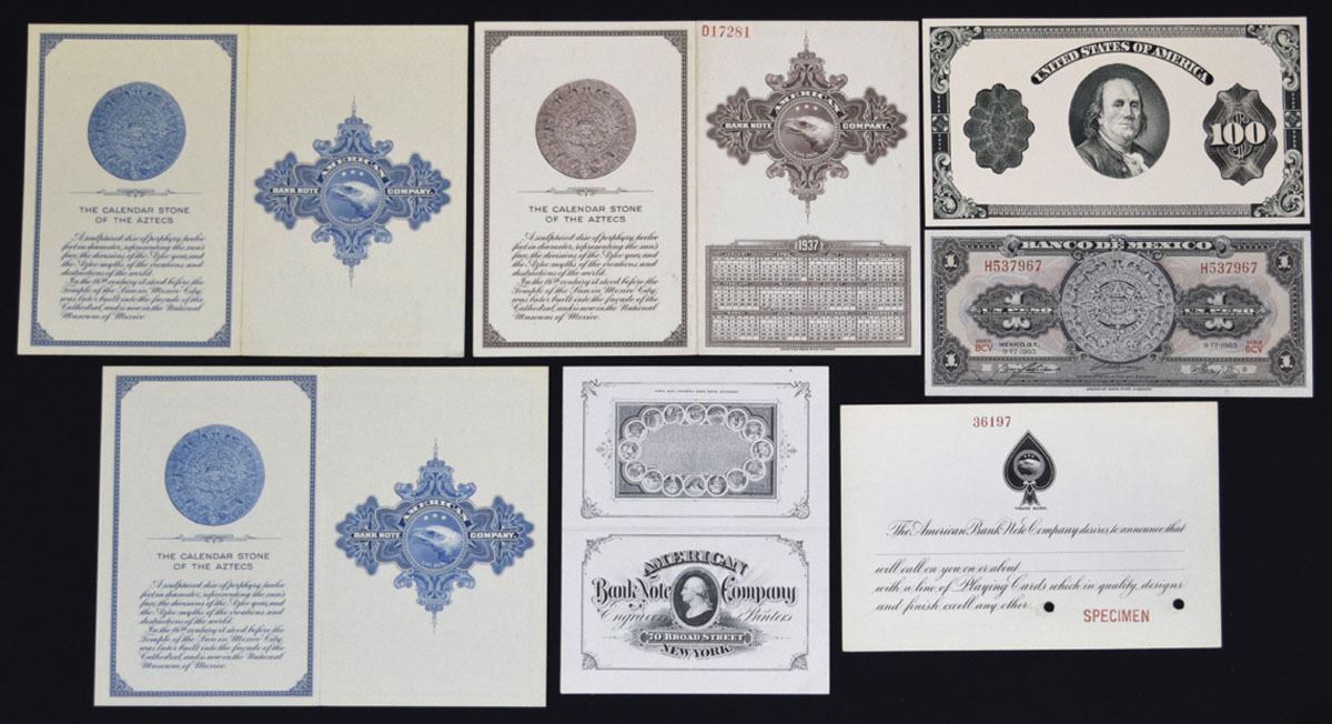 New York, Lot of 7 ABNC Advertising and presentation items Include 3 Perpetual calendars, 1 brown and 2 blue; a 1965, 1 Peso Mexican note with matching Aztec calendar; An ABNC Business card with micro-printed Declaration of Independence engraved Charles Toppan in 1840; a sample "100" denomination note with Franklin and a playing card item announcing a visit by one of ABN's agents. All are in Uncirculated to CU condition (7)