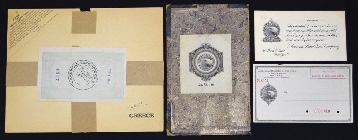 New York.... Lot of 4 items, includes a post card size notice requesting the return of specimens; a mailing label specimen; an ABNC Ex Libris Label on book cover, and an ABNC label on a stamp package, VF to Uncirculated condition. (4)