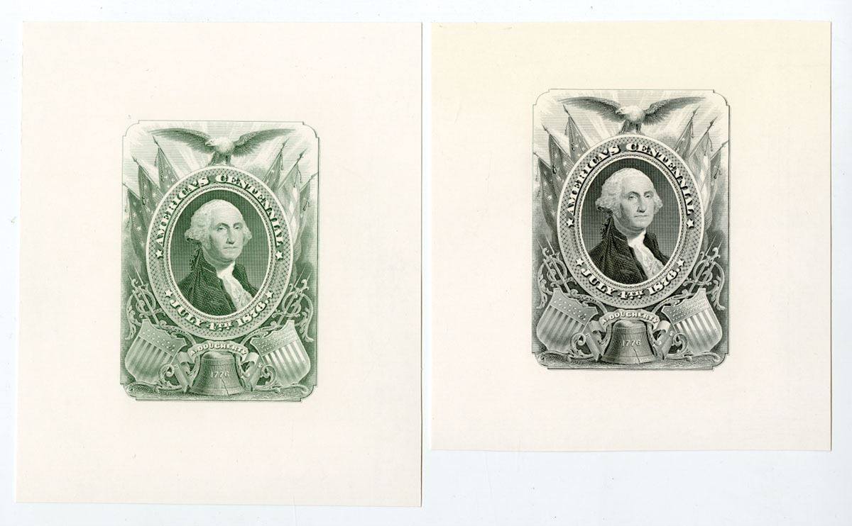 America's Centennial, 1876 (ca.1960-70s). Lot of 2 back of ABNC Printed Playing cards featuring George Washington at center, Intaglio printed on Glossy thin white card - one is in green and the other in black, CU condition. Though a later reprint, still an amazing and dramatic example of the engraver's art. (2). Sold "AS IS" no returns accepted.