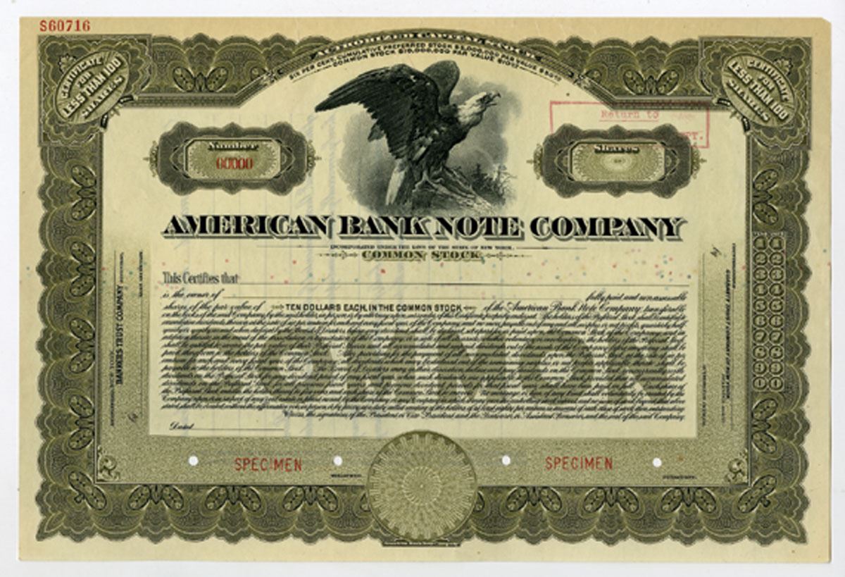 New York. <100 Shares Common Stock Specimen Certificate, Black print on brown/green border and under tint, Large Bald Eagle at top, Specimen overprints and POC's, AU to Uncirculated condition, ABNC.