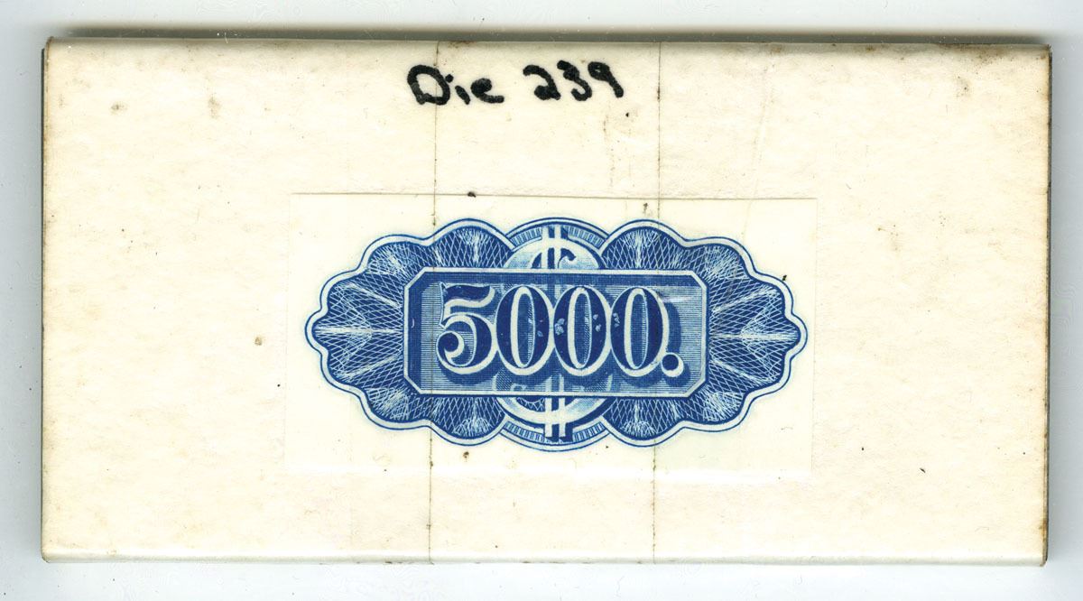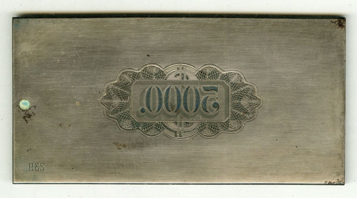 New York, ND (ca.1900 to 1950s). Steel Printing Plate with $5000, 5 x 2.5 inches, slightly more than 1/8th inch thick, Plate is in original holder with blue example printed on face and die# 239 written, Used on obsolete banknotes, stocks, bonds and fiscal documents, The plate is in exceptional condition for its age. From the archives of the American Bank Note Company.