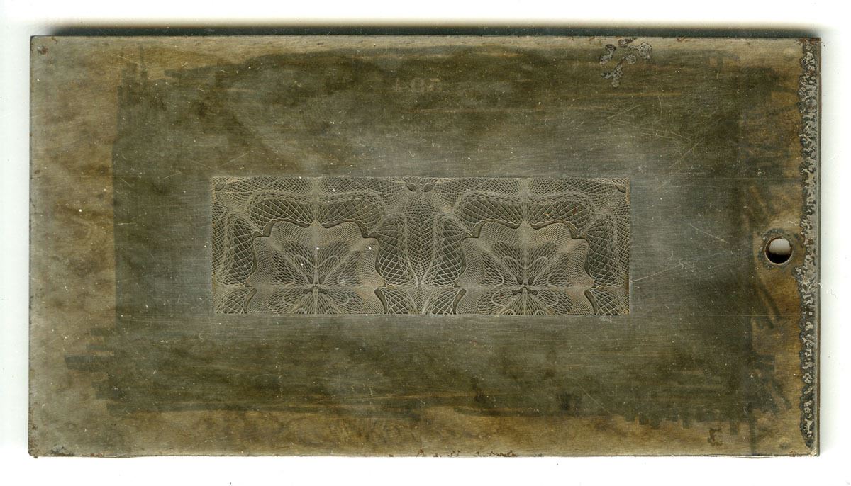 New York, ND (ca.1900 to 1950s). Steel Printing Plate with Decorative border, 4.75 x 2.5 inches, slightly more than 1/8th inch thick, Plate is in original holder with green example printed on face and die# 594 written, Used on obsolete banknotes, stocks, bonds and fiscal documents, The plate is in exceptional condition for its age. From the archives of the American Bank Note Company.