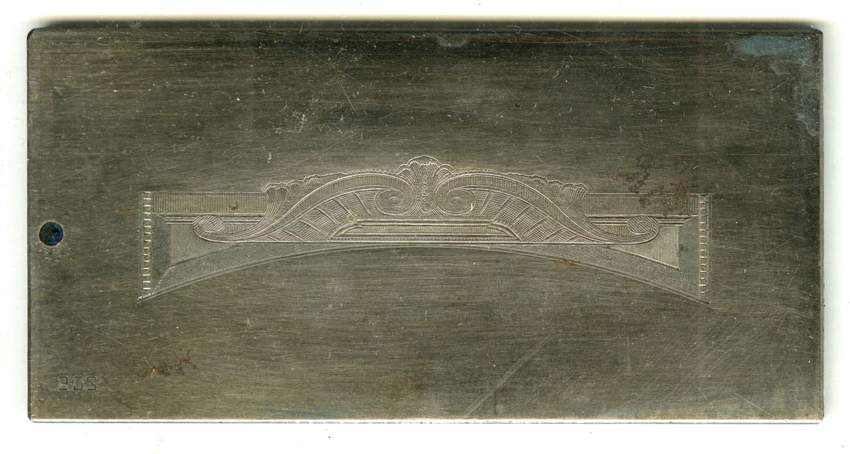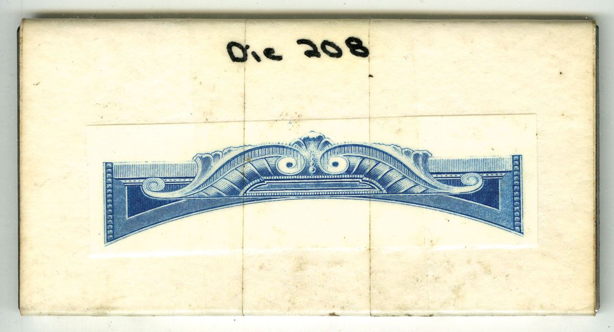 New York, ND (ca.1900 to 1950s). Steel Printing Plate with Decorative scrollwork, 5 x 2.5 inches, slightly more than 1/8th inch thick, Plate is in original holder with blue example printed on face and die# 208 written, Used on obsolete banknotes, stocks, bonds and fiscal documents, The plate is in exceptional condition for its age. From the archives of the American Bank Note Company.