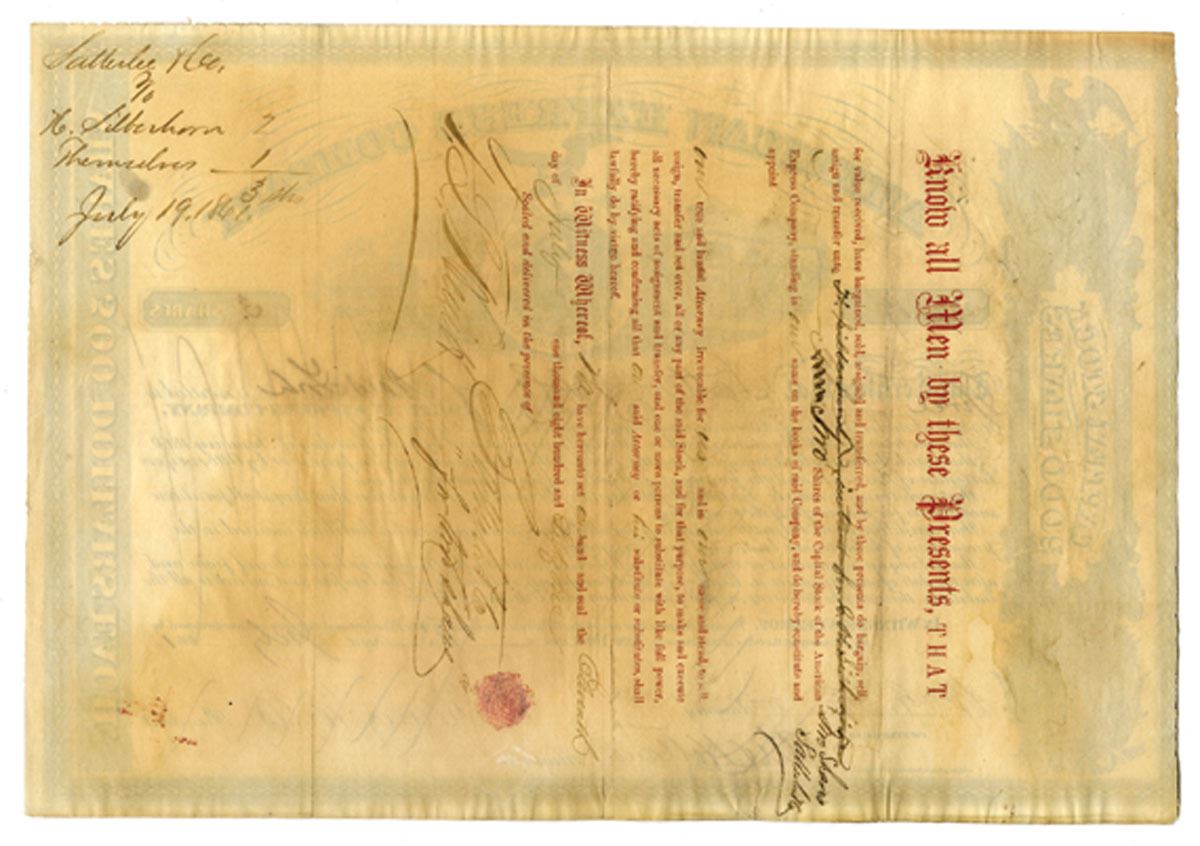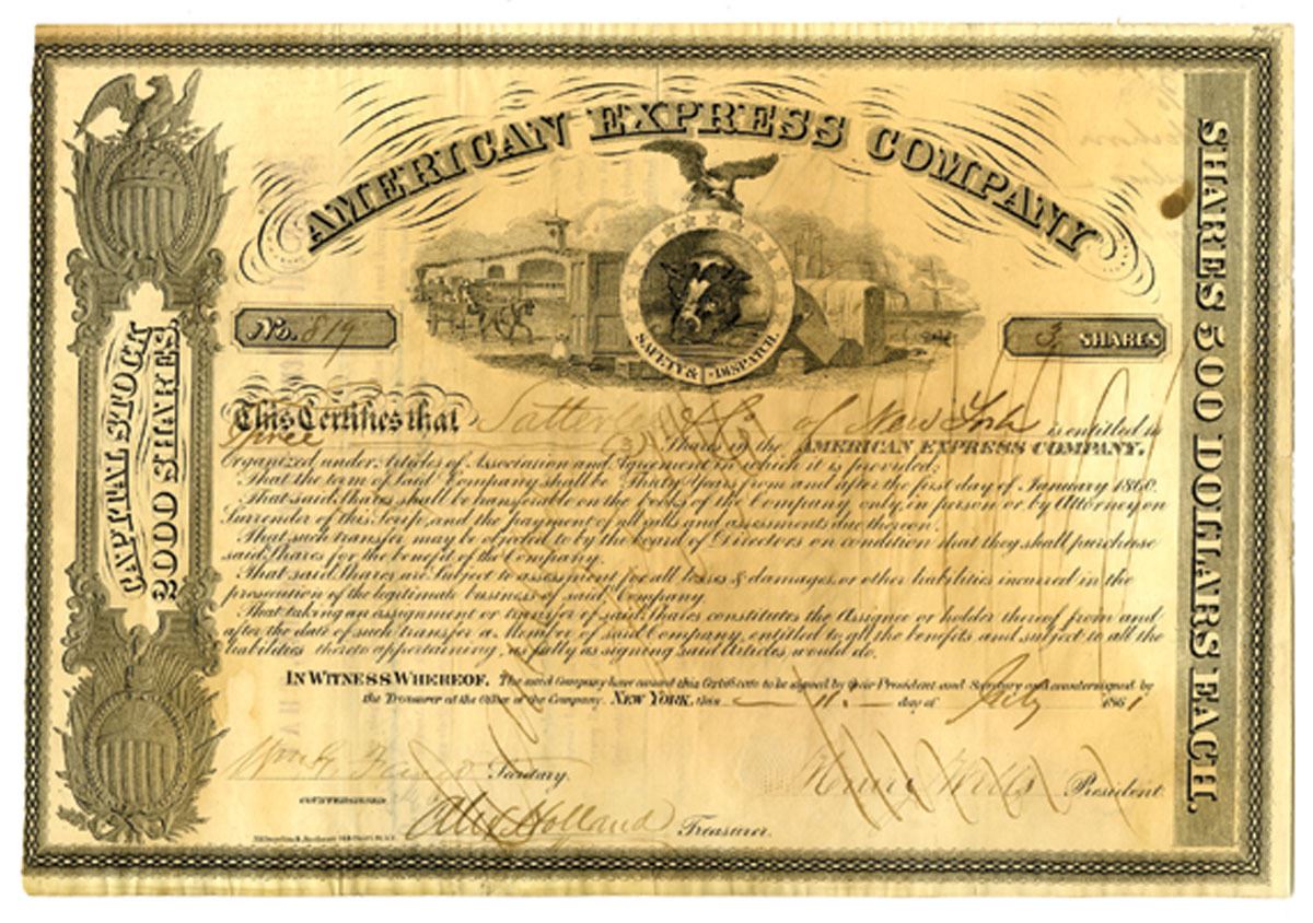 New York....., 1861. 3 Shares I/C Stock Certificate, Black print with black border with dog in circular frame at top guarding a safe and rail station and ship yard behind, S/N 819, Signed by Henry Wells the Co-founder of American Express and also founder of Wells, Fargo & Co., William G. Fargo who was another co-founder and initially served as Secretary of American Express ([before becoming President himself in 1866]. His signature as Secretary only appears on the earliest issues), and Alexander Holland who served as Treasurer, "Capital Stock 2,000 Shares", Certificate is in VF to XF condition. J. H. Duyckinck Stationer.