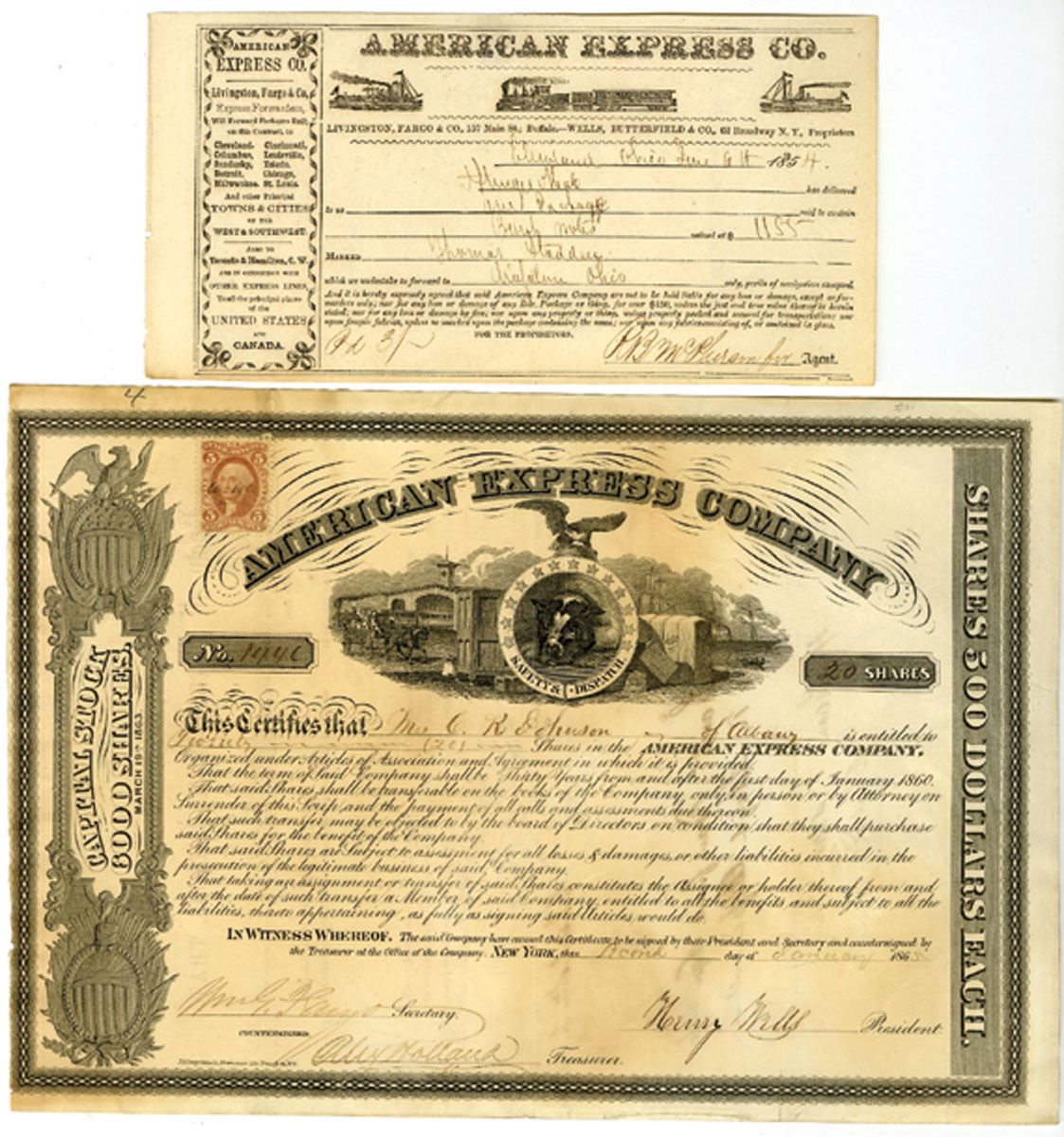 New York...., Lot of 2 items, Includes 1865. 1 Share, I/U but partially redeemed Stock Certificate, Black printing with black border with dog in circular frame at top guarding a safe and rail station and ship yard behind, S/N 1446 Signed by William G. Fargo the co-founder of American Express and Wells Fargo, as Secretary; Henry Wells, the co-founder of American Express, as President; and, Alexander Holland, as Treasurer, who was an early and important officer of American Express who helped manage its financial and administrative growth, "CAPITAL Stock 6,000 Shares" with a date of 'March 19th 1863 typed in purple beneath the 6000 Shares at left, VF condition or better. J. H. Duyckinck Stationer, NY; also includes an 1854, Cleveland, Ohio, "American Express package receipt for the delivery of "Banknotes" valued at $1155. List of all the cities it delivers to is at the left. VF condition. (2).