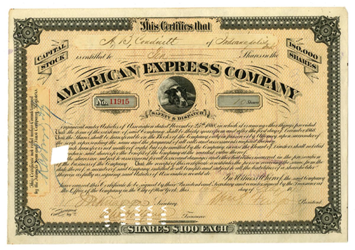 New York, 1875. 10 Shares I/C Stock Certificate, Black printing with black border and orange underprint, Dog in circular frame at center under title, Signed by "Wm G. Fargo" as President, "Alex Holland" as Treasurer, and "J. N. Knapp" as Secretary, S/N 11915, Cut out cancelled, VF condition, ABNC.