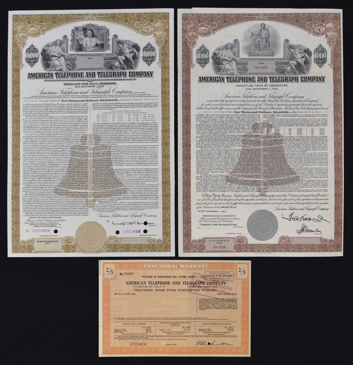 New York, 1924-57. Lot of 3 Specimen Certificates, Includes: 1924, 2/5 Fractional Warrant, orange, ; 1948, $10,000 3 3/8% Coupon Bond; 1957, $1000 5% Coupon Bond. All have Specimen overprints and POCs. Certificates range from AU to UNC Condition. (3). Sold "AS IS" no returns accepted.