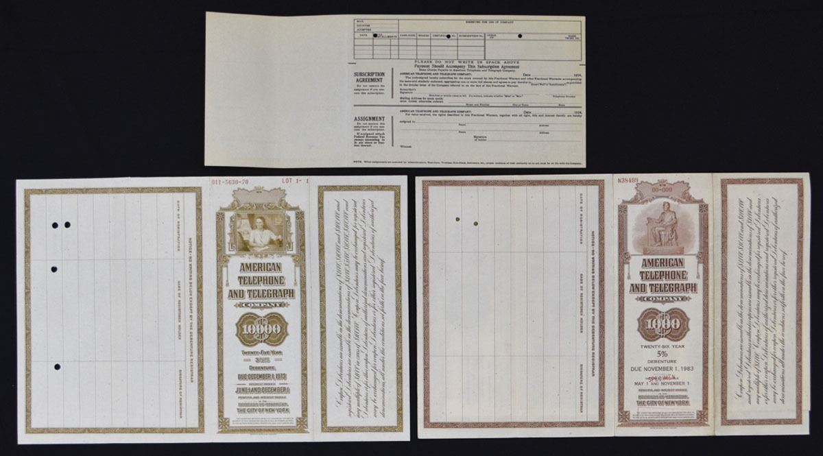 New York, 1924-57. Lot of 3 Specimen Certificates, Includes: 1924, 2/5 Fractional Warrant, orange, ; 1948, $10,000 3 3/8% Coupon Bond; 1957, $1000 5% Coupon Bond. All have Specimen overprints and POCs. Certificates range from AU to UNC Condition. (3). Sold "AS IS" no returns accepted.