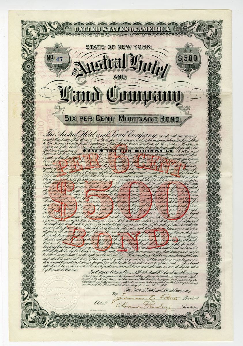 New York, 1890. $500 I/U 6% Second Mortgage Coupon Bond, S/N 47, Black text with black border and red underprint, Embossed seal at bottom left corner. Fine condition with faint stain at left margin, also fragile fold lines. The Austral Hotel was a hotel and resort property located in Brentwood, New York. It was developed to rival the resorts at Lakewood, New Jersey, which were very popular at the time. Once considered one of the finest hotels on Long Island, the Austral Hotel could accommodate around 230 guests when it was opened in 1888. Originally an estate belonging to Robert W. and Elizabeth Pearsall, the grounds were designed by Frederick Law Olmstead, who also designed Central Park and Prospect Park in New York City. Despite its location and amenities, the hotel never received the business expected and went bankrupt and was forced to close by 1892. The property was then purchased by the Sisters of St. Joseph in 1896, and became the Academy of St. Joseph, a Catholic school which was closed in 2009.