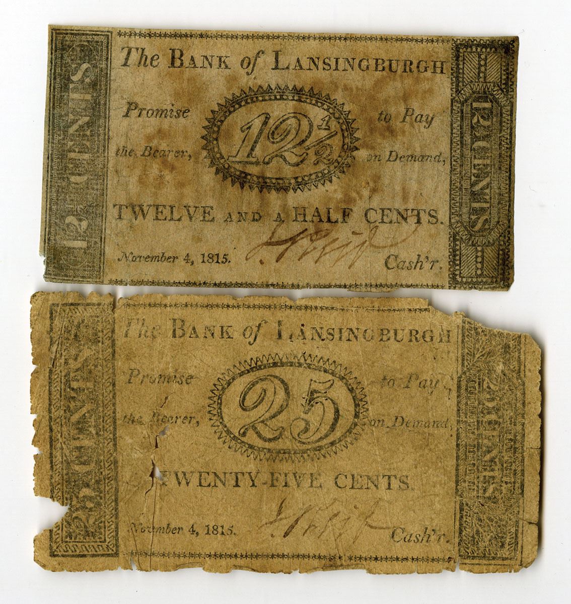 Lansingburgh......, NY. Lot of 2 Issued Scrip notes, Includes 10 Cents; and 25Cts, Obsolete Scrip Note Pair, Haxby UNL Harris H25 to H26, Black on beige paper, Denomination in large circle in middle, uniface, ornate sidebar counterfoils, No serial Numbers. The 25 Cent note is the Harris Plate note which was last sold in the, 2003 September CAA Sale #329, where it sold for $264.50. Rare note that rarely if ever comes up for auction. (2)