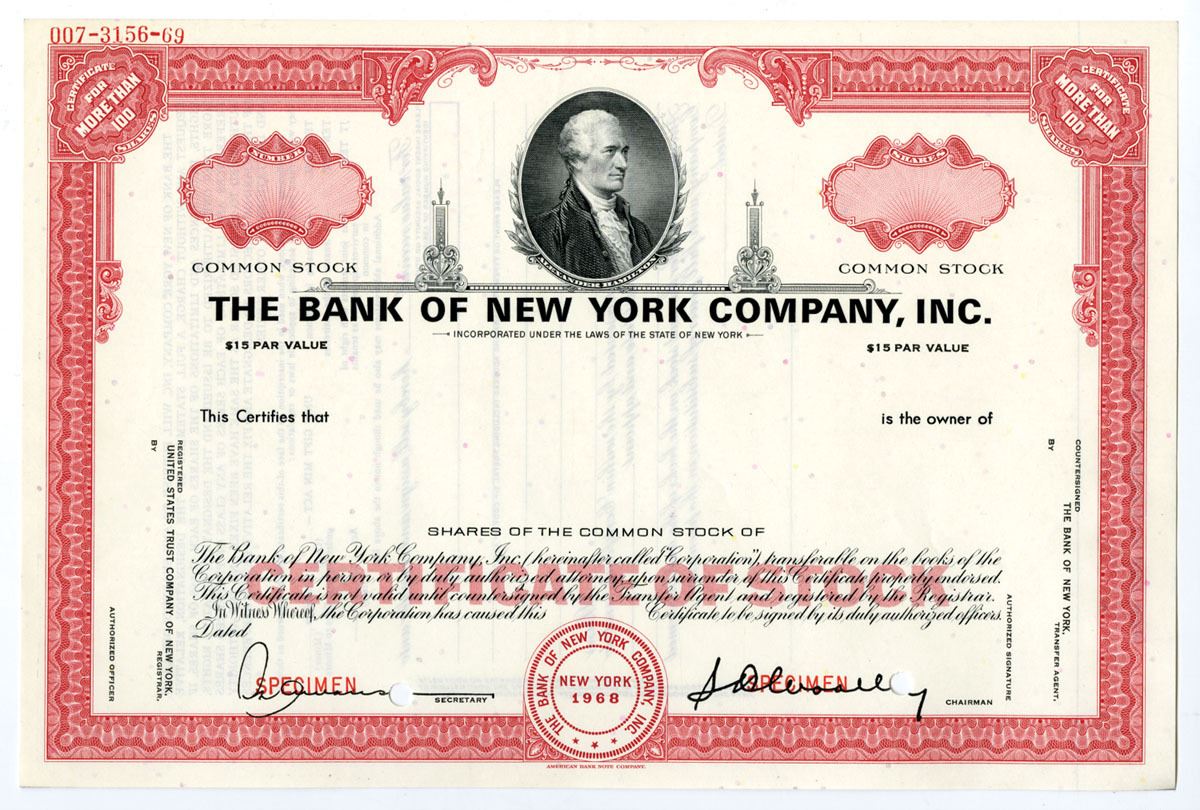 New York, 1968. >100 Shares Common Stock Specimen Certificate, Black text with red border and underprint, Alexander Hamilton portrait at top center, Specimen overprints and POCs, Uncirculated condition, ABNC. The Bank of New York was the first company to be traded on the New York Stock Exchange when it first opened in 1792.
