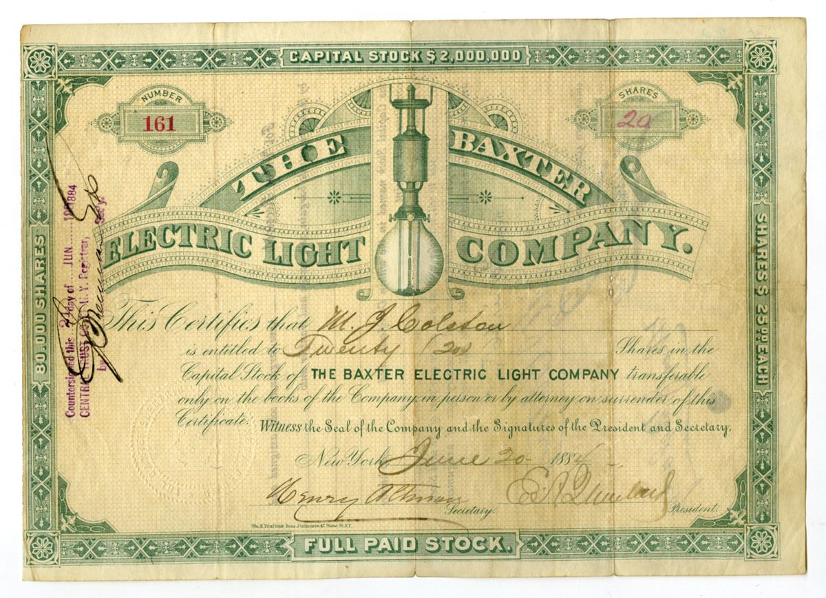New York, NY. 20 Shares, I/U, Green on light beige underprint, early electric light bulb in center, S/N 161, Choice Fine to VF condition with 4 small pin holes UL and 2 small internal 3mm tears, all difficult to view. Scarce and attractive stock certificate. the first electric light was invented by Humphry Davy ca.1802 to 1805, but it was not until the 1870s, when Swan and Edison, independently from each other, developed the first long lasting light bulbs and that electric light bulbs would become commercially feasible to manufacture in large quantities. It was estimated in 1885 only 300,000 electric lamps had been sold. Baxter Electric Light Company can be considered an early light bulb manufacturer pioneer. Rare stock certificate.