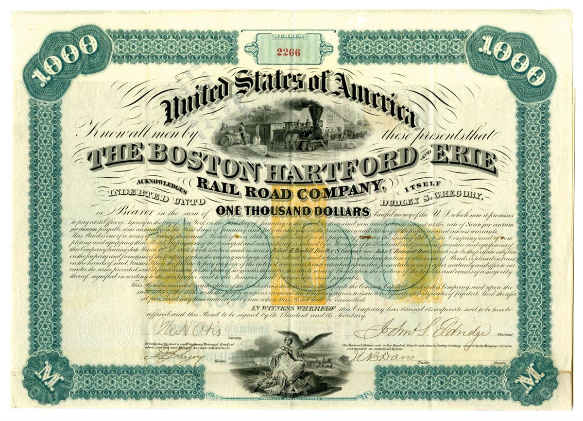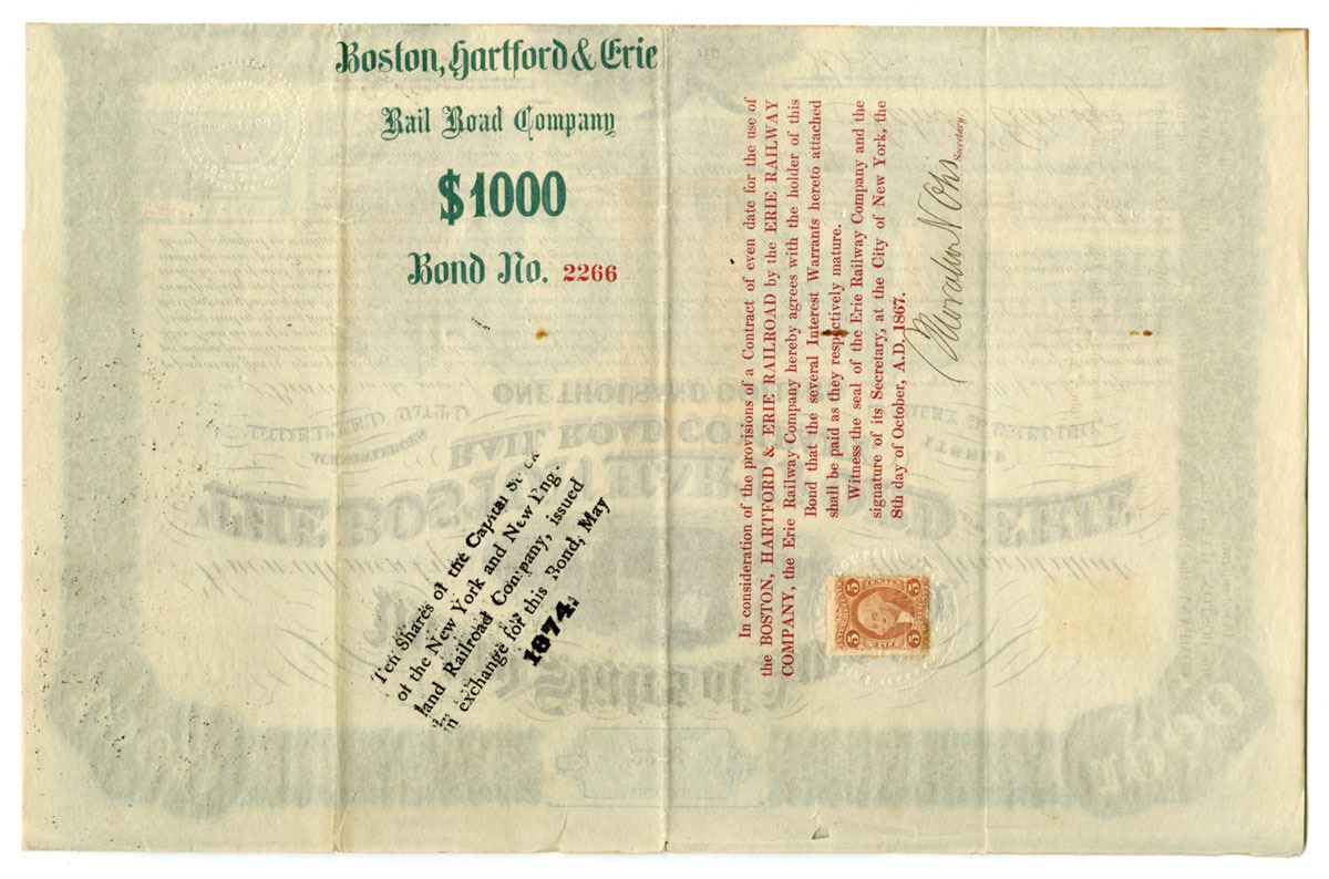 New York, 1867. $1000 I/U 7% Coupon Bond, Black print with green border on large certificate, Train vignette under title, S/N 2266, Three $1 revenue stamps under title and 5 cent stamp on back, VF to XF condition. An issued-unused bond of the Boston, Hartford and Erie Railroad Company, dated 1867, representing financing for one of the most ambitious and ultimately ill-fated railroad expansion schemes in post–Civil War New England. The bond is attractively engraved with period security printing, bearing the company title prominently across the face, with printed bond text and spaces for interest coupons (as issued). This example is signed by Eldridge, an officer of the company