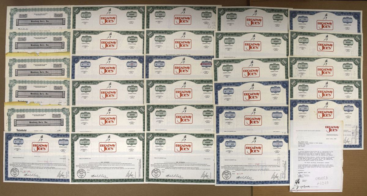 Florida & New York. Lot of 35 I/C Stock Certificates from Broadway Joe’s, Inc., a restaurant chain famously associated with New York Jets quarterback Joe Namath, Highlighted by a founding share S/N 9, made out to Joseph (Joe) Namath, but not endorsed by him, for 145,000 Shares. Also included are certificates that are similar unvignetted designs, made out to Clarence Achee, for 37,500; 37,500; and 10,000 Shares, who was Secretary and trustee of the company; Thomas Marshall, for 95,000 shares; and, S/N 8 issued to Michael H. Bite, Jr., for 95,000 shares. Also Features 22 public shares with the Broadway Joe's logo, green-bordered certificates in denominations of 100 shares, and, 7 blue-bordered certificates in denominations of 5, 25, or 100 shares. All certificates prominently display the red “Broadway Joe’s” logo and are signed by company officers. Included with the lot are two original corporate letters on Broadway Joe’s letterhead dated 1969, referencing shareholder information. A nostalgic and visually engaging group tied to a unique intersection of sports celebrity and American business history. Sold "AS IS" no returns accepted.