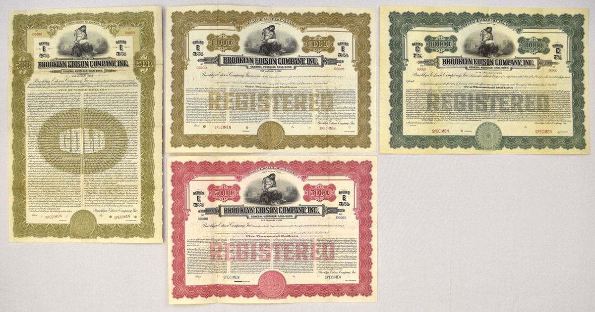 Brooklyn, New York, 1919 to 1932. Lot of 4 Specimen Bonds, Includes: 1919, $10,000 Registered 7% General Mortgage Gold Bond; 1932, $1000 5% Registered General Mortgage Gold Bond; $5000 5% Registered General Mortgage Gold Bond; 1932, $500 5% General Mortgage Gold Coupon Bond. Bonds range from VF to XF condition and printed by ABNC. (4). Sold "AS IS" no returns accepted.