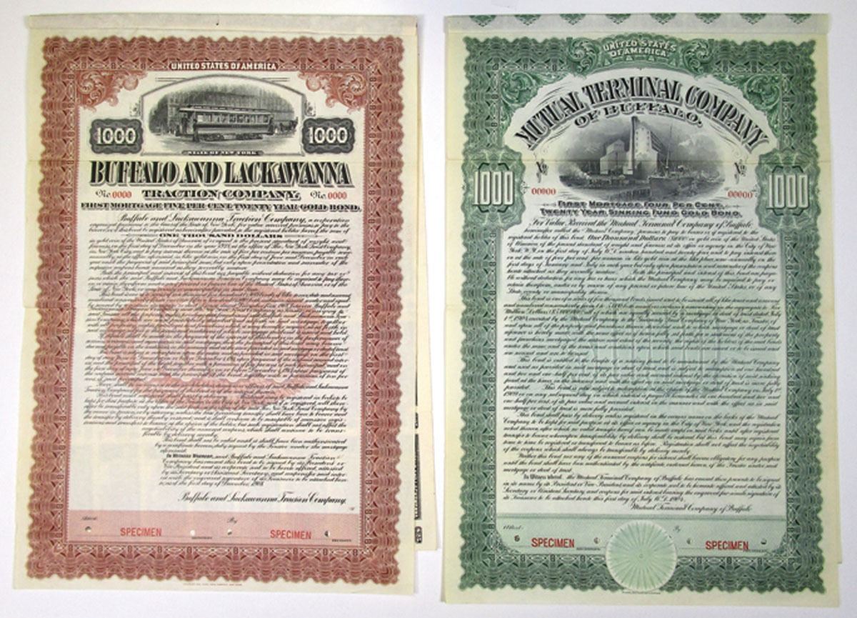 New York, 1904 and 1908, Lot of 2 Specimen Bonds, Includes: 1904, Mutual Terminal Co. of Buffalo $1000 4% First Mortgage Twenty Year Sinking Fund Gold Coupon Bond, Black with green border; 1908, Buffalo and Lackawanna Traction Co. $1000 5% First Mortgage Twenty Year Gold Coupon Bond, Black with brown border. Both have Specimen overprints, POCs, are in VF to XF condition, and printed by Franklin Lee BNC. Attractive railroad bond pair.