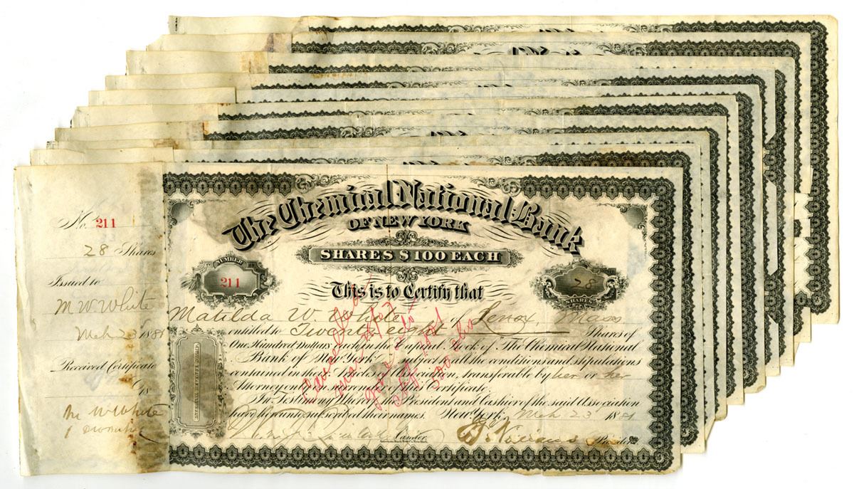New York, New York, 1878-81. Lot of 9 I/C Capital Stock Certificates for Various Shares, All have black print with black border and company title at top center, Certificates are all hand cancelled across center, Very probably issued to New York notables, Condition ranges with Fine to VF condition with stains. ABNC. (9). Sold "AS IS" no returns accepted.
