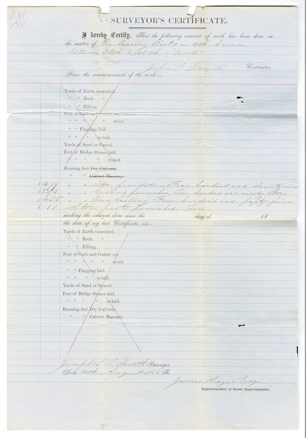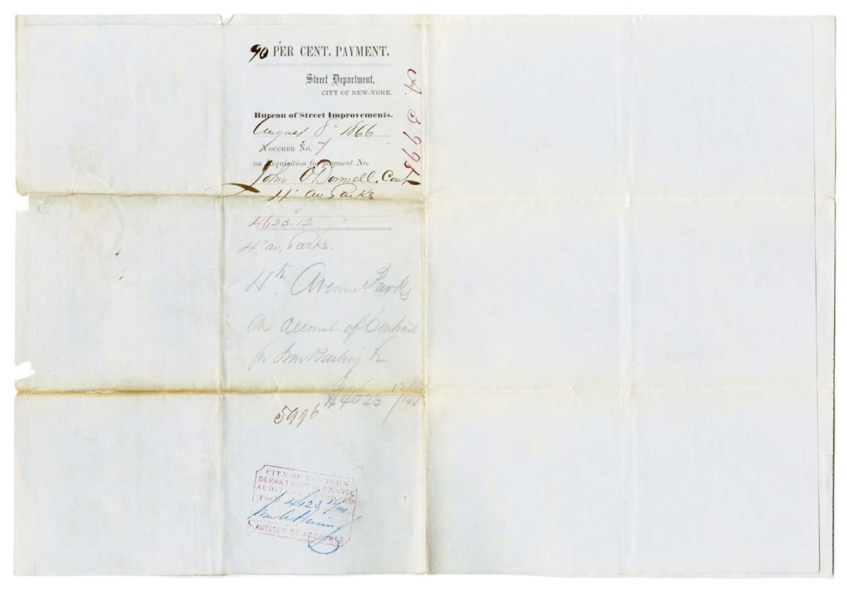 New York City. August 4, 1866. Surveyor's Certificate regarding enclosing parks on 4th Avenue between 38th Street and 40th Street in Manhattan, New York, filled out by Surveyor Joseph Smith and signed by the Street Commissioner, William "Boss" Tweed. Tweed was an American politician most notable for being the political boss of Tammany Hall, the Democratic Party's political machine that played a major role in the politics of 19th-century New York City and state. Tweed was elected to the United States House of Representatives in 1852 and the New York County Board of Supervisors in 1858, the year that he became the head of the Tammany Hall political machine. He was also elected to the New York State Senate in 1867. However, Tweed's greatest influence came from being an appointed member of a number of boards and commissions, his control over political patronage in New York City through Tammany, and his ability to ensure the loyalty of voters through jobs he could create and dispense on city-related projects. The document describes the work, such as the stone foundations and railings, along with the corresponding prices given by contractor John Donell. This location in Manhattan no longer has a park, and must have been developed in the years following this survey. It provides a fascinating glimpse into New York City's past, before skyscrapers and modern developments, when there were more open spaces and parks. Rare.