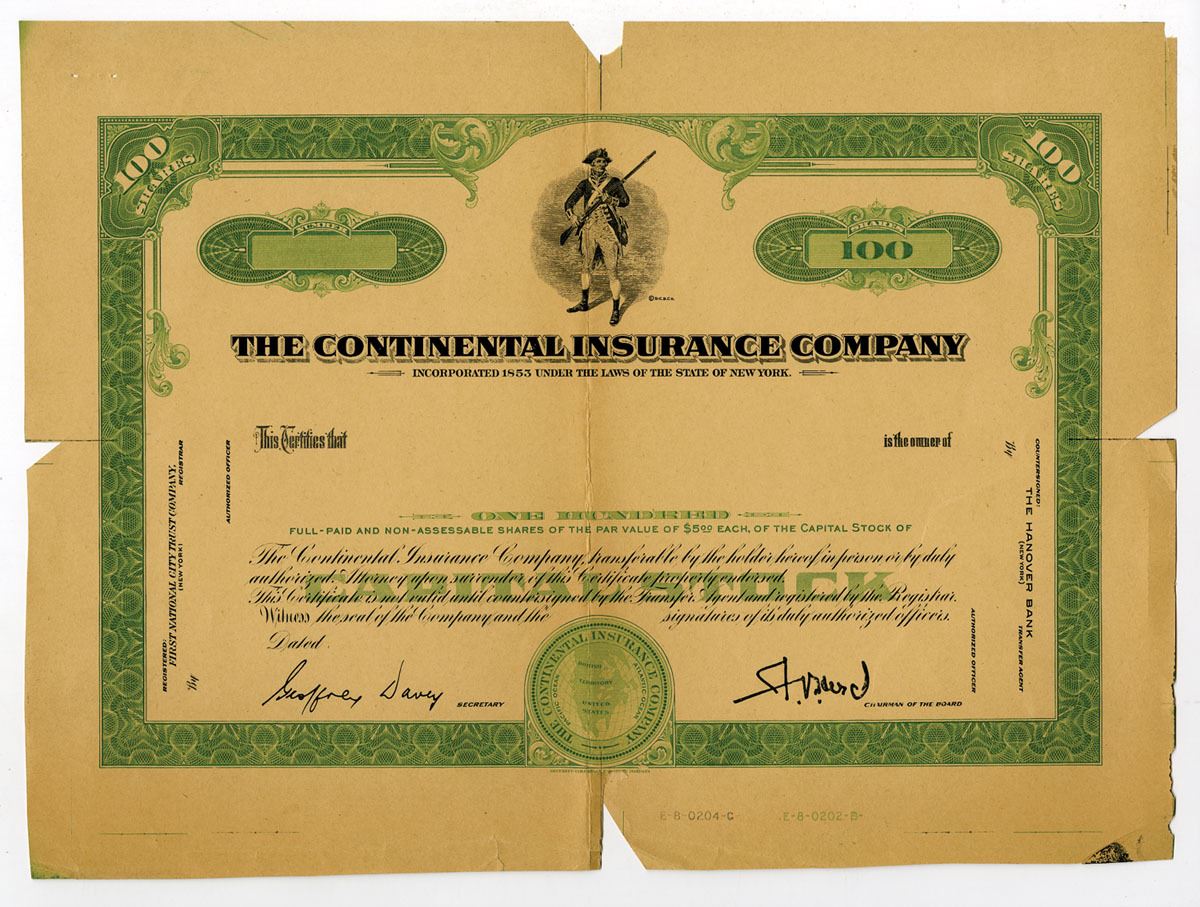 New York, ND (1920-40s). 100 Shares Proof Stock Certificate, Black text with green border and underprint, Man with musket and drum at top center, Printed on tan oversized paper, AU to UNC condition, S-CBNC.
