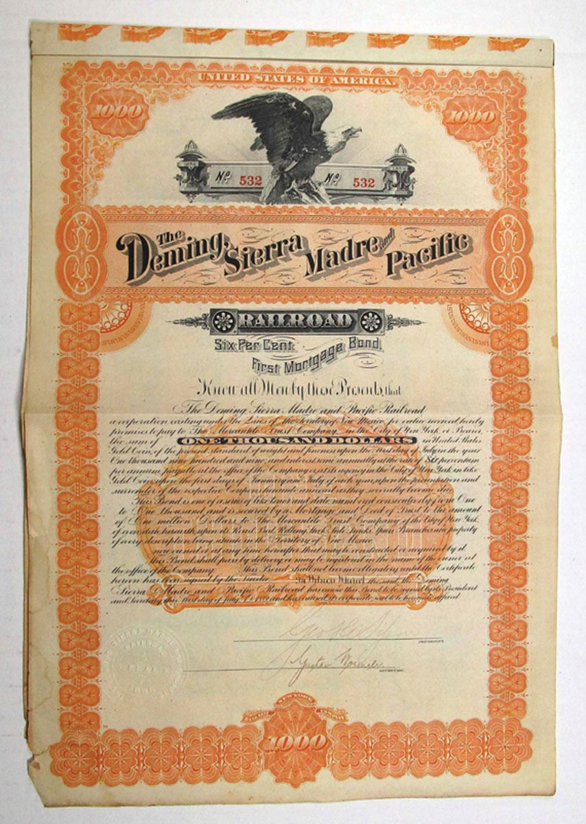 New York. Deming Sierra Madre & Pacific Railroad Co., 1889. $1000 I/U 6% Coupon Bond. VF-XF.