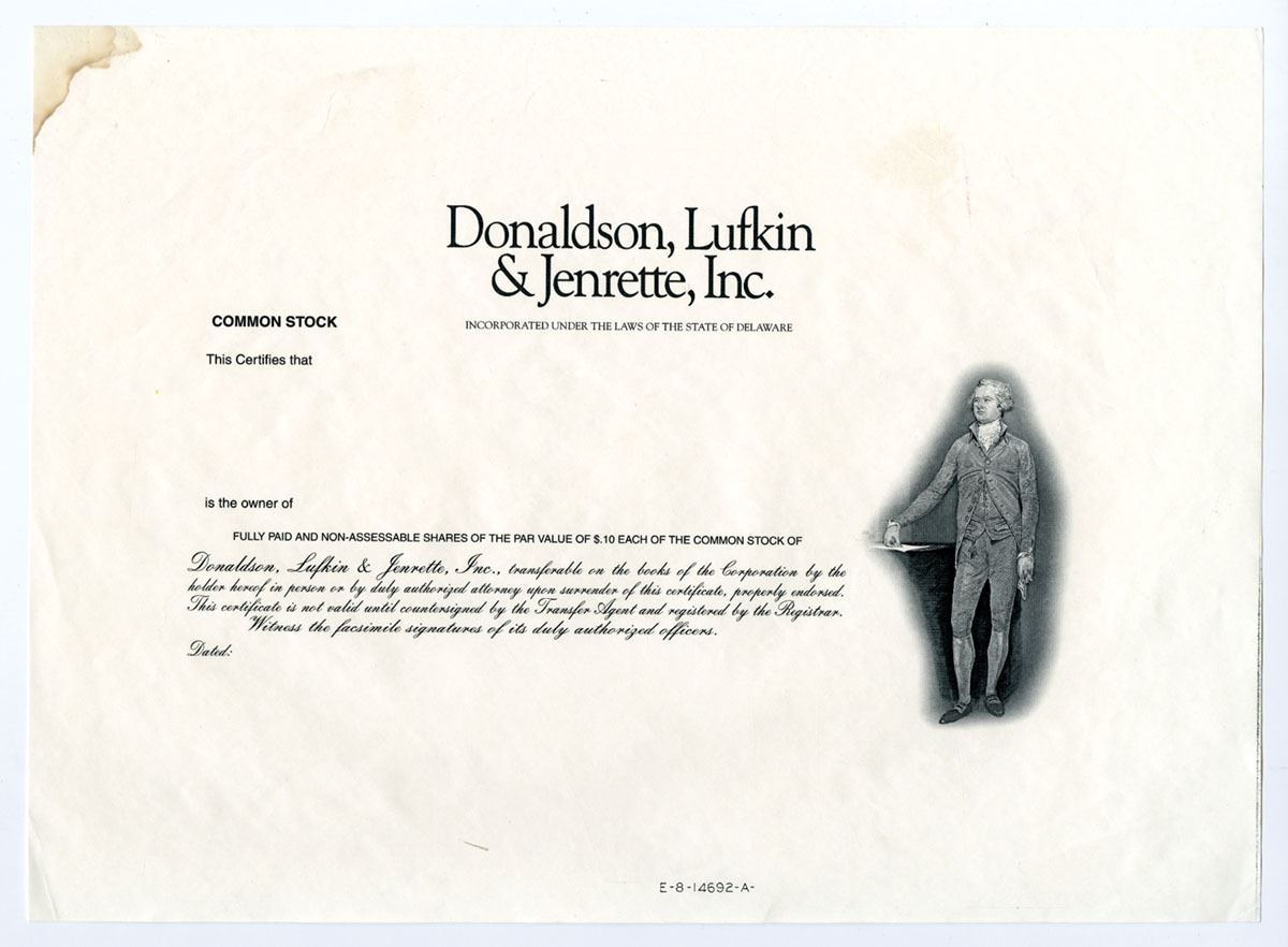 ND (ca.1970-80's), Common Stock, Proof on bond paper of black portions only, James Madison, VF to XF, Stain on top left corner. Donaldson, Lufkin & Jenrette (DLJ) was a U.S. investment bank founded by William H. Donaldson, Richard Jenrette, and Dan Lufkin in 1959. Its businesses included securities underwriting; sales and trading; investment and merchant banking; financial advisory services; investment research; venture capital; correspondent brokerage services; online, interactive brokerage services; and asset management. In the 1980s and 1990s, they expanded into other fields, such as high yield fixed income, or "junk bond" securities. A major factor in DLJ's underwriting and trading success could be attributed to the employees recruited from Drexel Burnham Lambert when the firm declined in the late 1980s and declared bankruptcy in 1990. Rare if not unique proof stock certificate.