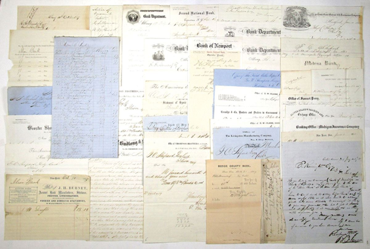 New York, ca. 1850-1860s. Lot of over 35 items. Fiscal Correspondence from various New York State Banks, all dating from the Obsolete and early National Bank Note era, including transmittal letters to and from banks, merchants and banking houses regarding collection on their notes or invoices, and other handwritten communications. A variety of paper sizes, handwriting, and includes letterheads. Banks include: Ilion Bank; Wooster Sherman's Bank; Thompson Brothers, Bankers; Commission House of Budlong & Stokes; American Exchange Bank; Dodge County Bank; and Oliver Stark's Banking and Exchange Office. All are in VF or better condition. Unchecked for signatures or content and from a new find. (35+)