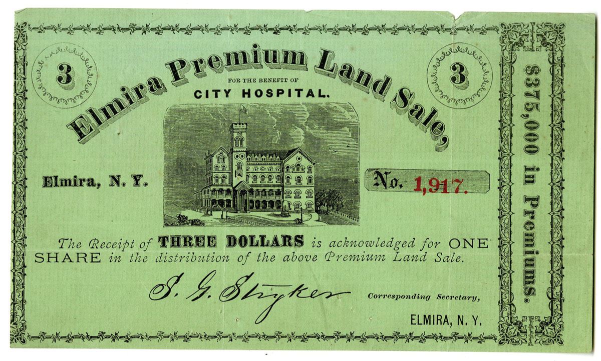 New York, ND (1870-80s). Issued lottery certificate appearing to be a stock certificate to avoid having issues for gambling due to it actually being used as a lottery ticket of $3 exchanged for one share "in the distribution of the…Premium Land Sale." Black text with black border on off-green paper, Building depicted at center. S/N 1917, Signed by S. G. Stryker. VF condition with some splitting at top right margin.