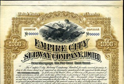 1892. $1,000. Specimen 1st Mortgage 6% Gold Bond. Light brown border. Allegorical woman seated on winged wheel. Fine condition with splitting on top fold that could be reinforced. Coupons attached. POC's. FBNC.