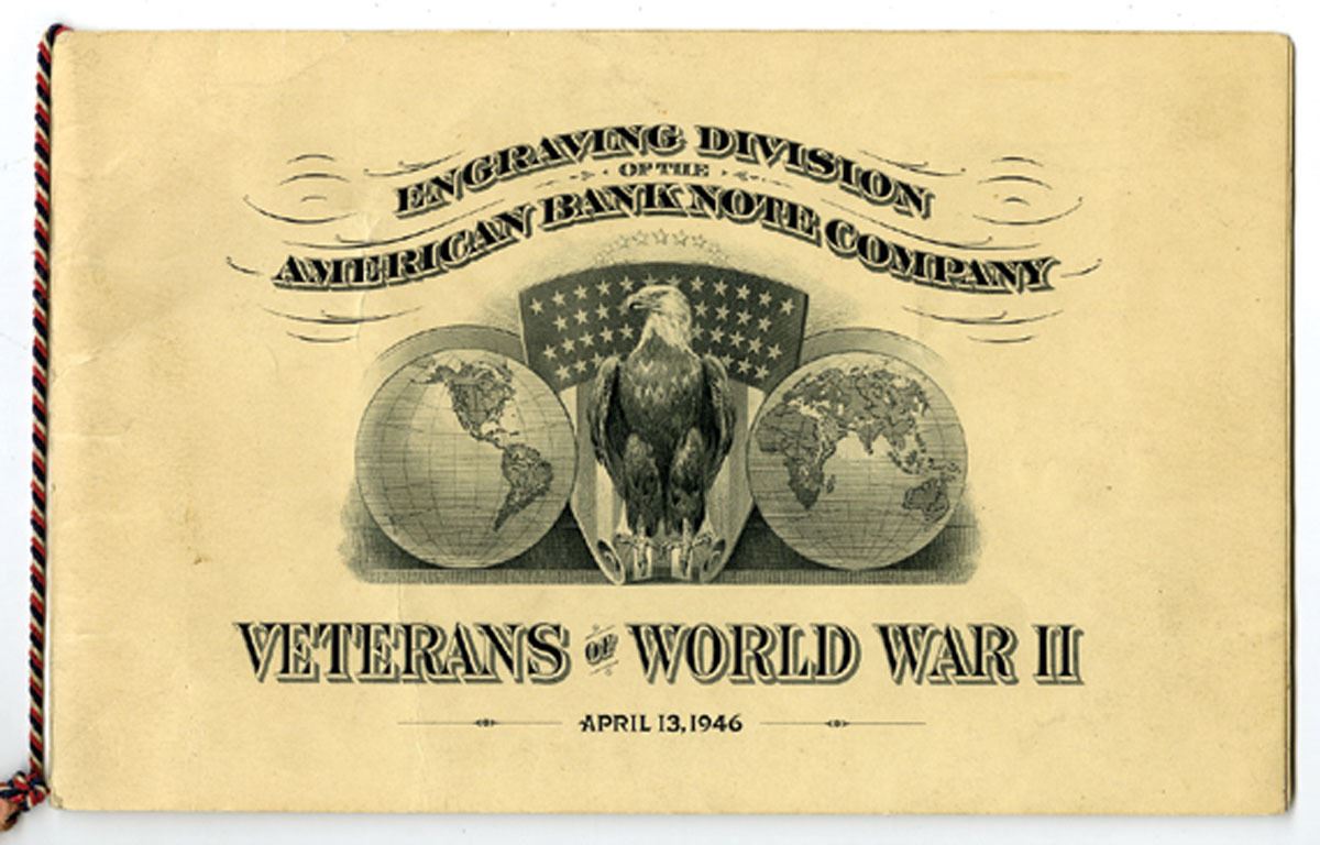 April 13, 1946. 4 Page (double sides) dinner program with menu on first page and portraits of soldiers printed on pages, intaglio front and back covers with patriotic eagle and flag-shield with globes, back cover with "Welcome Home - 1946"and hands shaking, XF condition. ABNC.