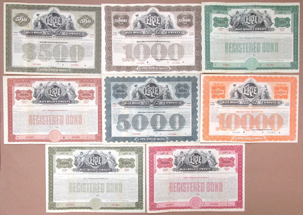 New York, 1896 and 1903. Lot of 8 Specimen Registered Bonds, Include 4 examples of 1896, No Series, $500 with Olive, $1000 with Brown, $5000 with Blue, $10,000 with Orange 4% Prior Lien Gold Bonds; and 1903, Series A, $1000 with Green, $5000 with Brown, $10,000 with Olive, and $50,000 with Red 4% Convertible Gold Bonds. All have Specimen overprints, POCs, are in XF to AU condition, and printed by ABNC. (8). Sold "AS IS" no returns accepted.