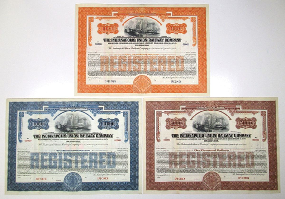 New York, 1903, Lot of 3 Specimen Bonds, Includes: $1000 4% Series B Convertible Fifty Year Registered Gold Bond, Black with blue border; $5000 4% Series B Convertible Fifty Year Registered Gold Bond, Black with orange border; $10,000 4% Series B Convertible Fifty Year Registered Gold Bond, Black with brown border. All have Specimen overprints, POCs, are in VF to XF condition, printed by ABNC. (3). Sold "AS IS" no returns accepted.