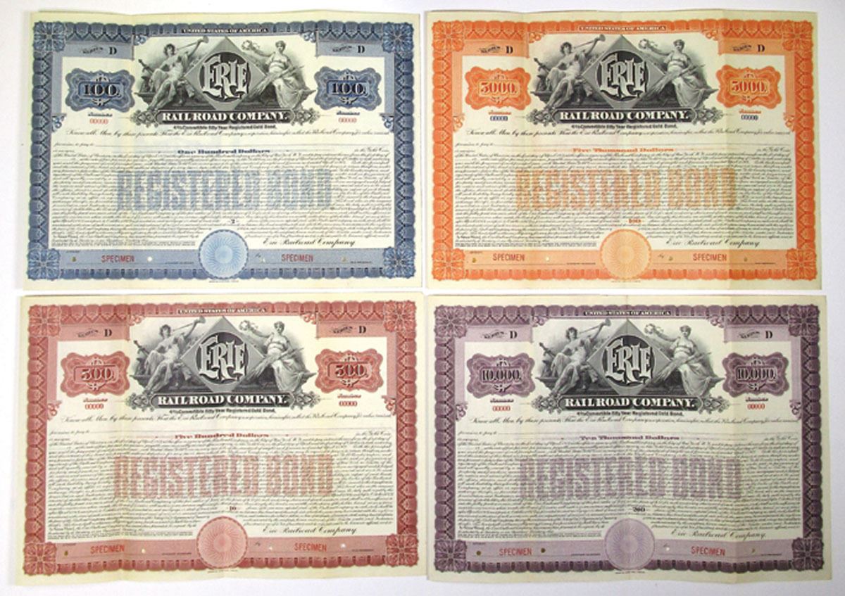 New York, 1903, Lot of 4 Specimen Bonds, Includes: $100 Registered 4% Series D Convertible Fifty Year Gold Bond, Black with blue border; $500 Registered 4% Series D Convertible Fifty Year Gold Bond, Black with brown border; $5000 Registered 4% Series D Convertible Fifty Year Gold Bond, Black with orange border; $10,000 Registered 4% Series D Convertible Fifty Year Gold Bond, Black with purple border. All have allegorical figures flanking company name at top center, Specimen overprints and POCs, are in VF to XF condition, printed by ABNC. (4). Sold "AS IS" no returns accepted.